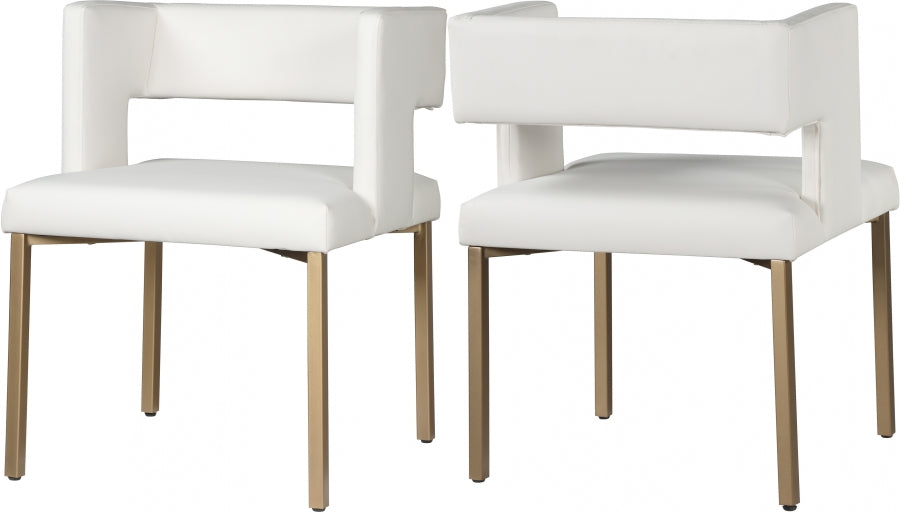 Ajoutez la chaise de salle à manger en similicuir blanc Caleb à votre salle à manger pour un confort et un style ultimes. Cette chaise a une assise carrée et un dossier bas ouvert en bas vers l'arrière et sur les côtés. Quatre pieds carrés en fer doré brossé permettent soutien et stabilité, tandis que le velours doux et le rembourrage de la chaise permettent un air de luxe. Plusieurs tables disponibles complètent parfaitement cette pièce contemporaine.