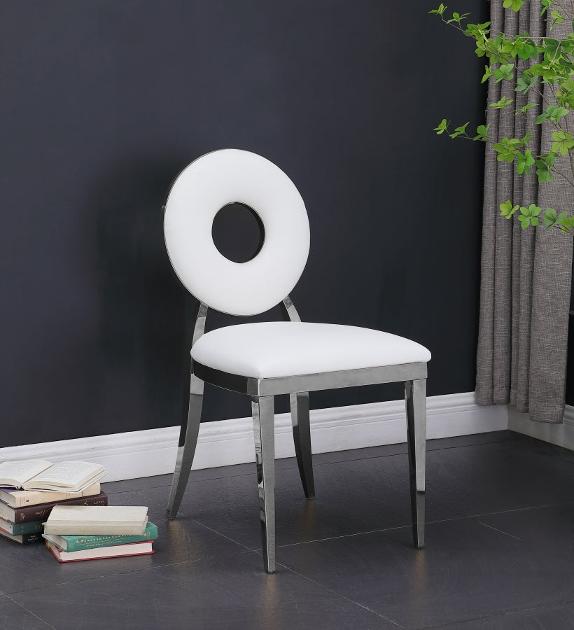 Cédez au décorateur intérieur lorsque vous ramenez à la maison cette chaise de salle à manger en similicuir Carousel. Cette chaise présente une structure en métal et des pieds finis en acier inoxydable chromé pour une touche moderne, mais la véritable star du spectacle est le dossier en forme de beignet qui dégage un charme contemporain indéniable. Le siège et le dossier sont à la fois rembourrés pour plus de confort et recouverts de similicuir blanc doux pour un look chic.
