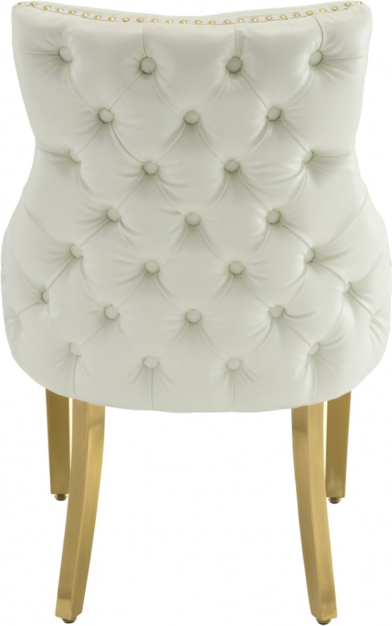 La chaise de salle à manger en similicuir Tuft est un véritable incontournable sous tous les angles, ce qui en fait un incontournable parmi les convives. Le revêtement en similicuir blanc riche et luxueux offre à cette belle chaise une sensation de luxe, tandis que la garniture de tête de clou et les détails de capitonnage de boutons assurent son rôle d'élément esthétique dans votre espace. Les pieds en acier inoxydable doré offrent le soutien nécessaire pour une durabilité à long terme.