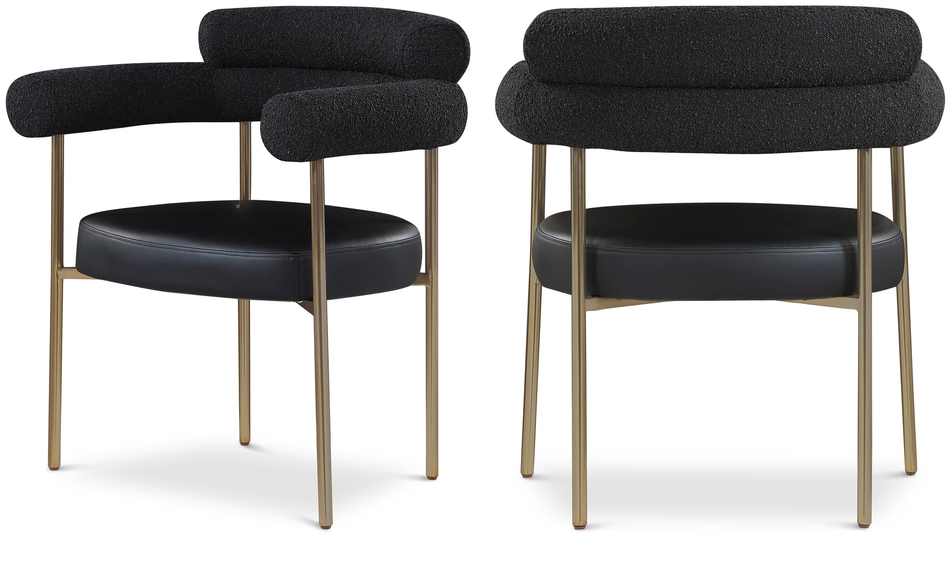 Le confort arrive à l'heure des repas avec cette chaise de salle à manger en tissu bouclé Blake et en cuir végétalien. Cette jolie chaise est le choix idéal pour votre salle à manger moderne, avec son dossier incurvé qui vous berce confortablement pendant que vous dégustez du vin et dînez toute la nuit. Un siège en cuir végétalien doux et épais confère à cette chaise un look élégant et haut de gamme tout en garantissant sa performance et sa beauté continues. La finition en laiton brossé de la chaise protège sa structure en fer entièrement métallique.