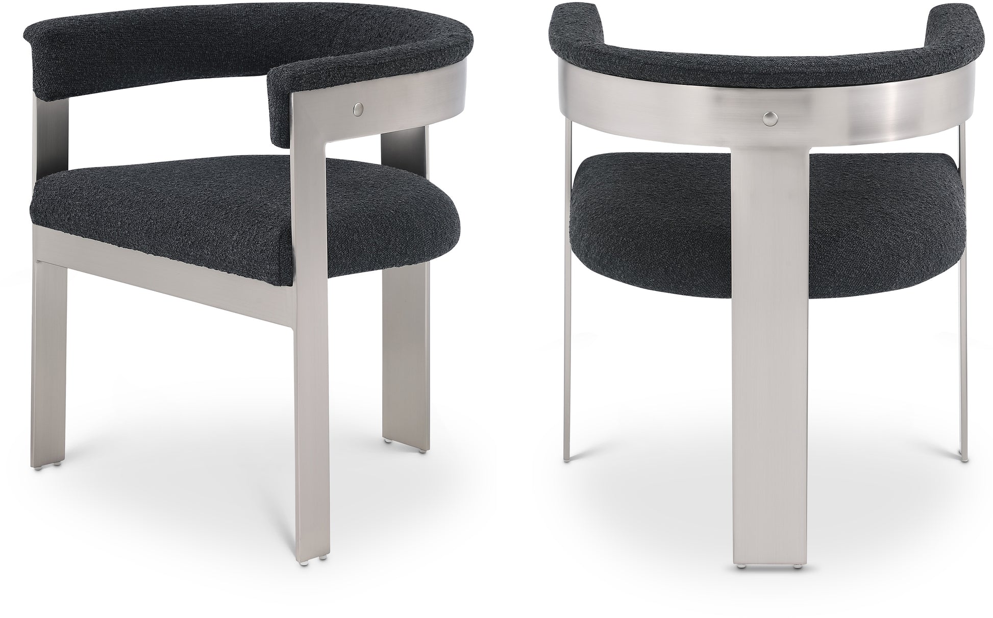 Profitez d'une expérience culinaire élevée en ramenant à la maison ces chaises de salle à manger en boucle Romeo, vendues par ensemble de deux. Dotées de sièges et de dossiers recouverts d'un tissu bouclé doux, ces chaises offrent à la fois style et confort. Les cadres en métal chromé brossé ajoutent une touche contemporaine, faisant de cette paire de chaises de salle à manger un ajout chic à votre salle à manger. Les dossiers incurvés offrent non seulement un look élégant, mais également un soutien optimal pour le corps, garantissant que les convives soient détendus de l'apéritif au dessert.