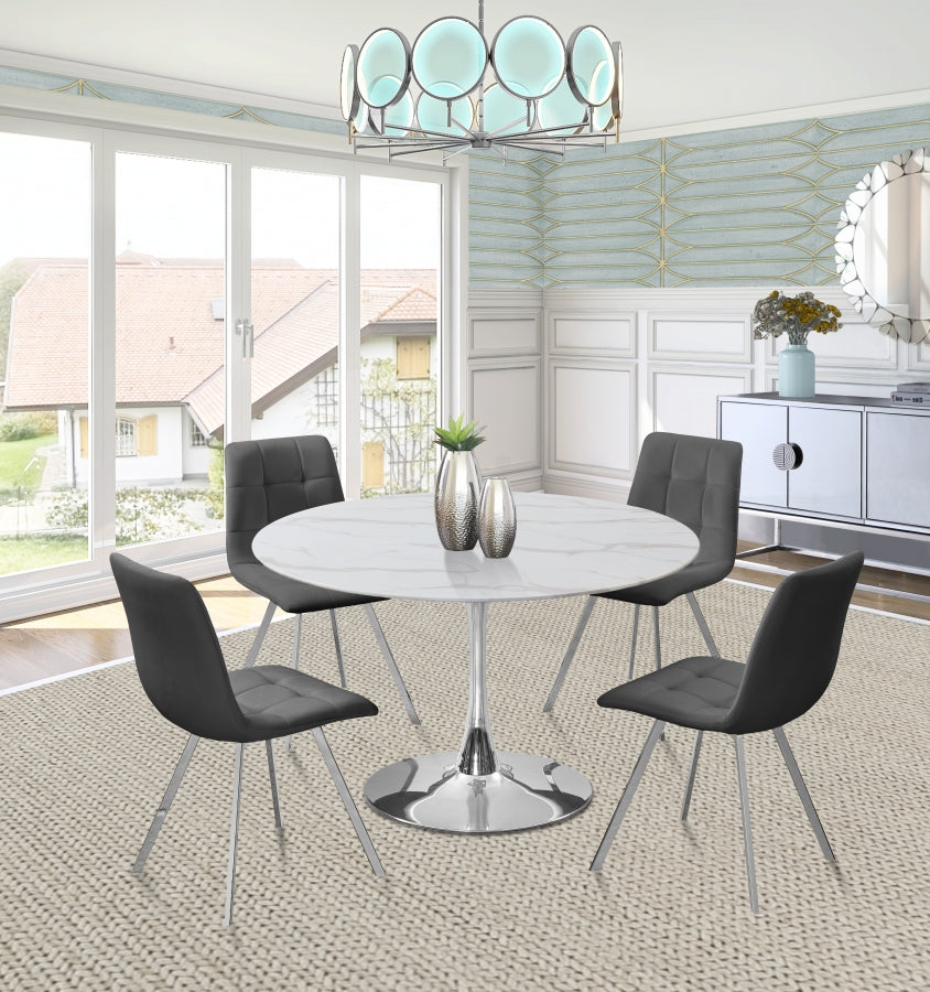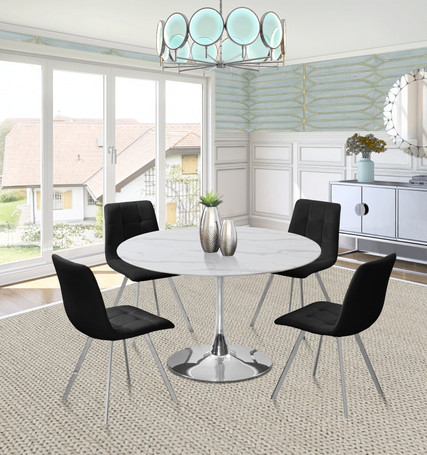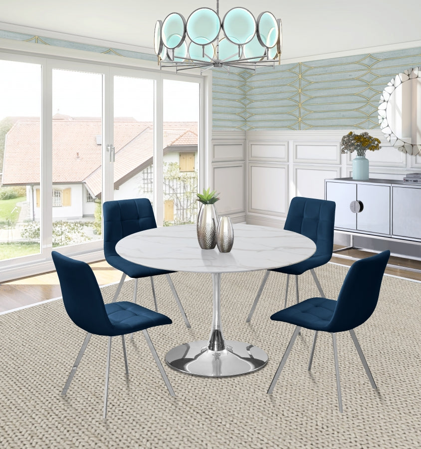 Tirez vers le haut la chaise de salle à manger en velours bleu marine Annie et asseyez-vous un peu. Ornée d'un capitonnage attrayant, cette chaise légère et contemporaine est dotée d'un dossier qui s'incurve doucement dans le siège, et les deux sont rembourrés pour votre confort. Les pieds en métal chromé sont de forme carrée et s'inclinent gracieusement pour donner à cette chaise une stabilité accrue. L'Annie se marie bien avec plusieurs tables de salle à manger disponibles.