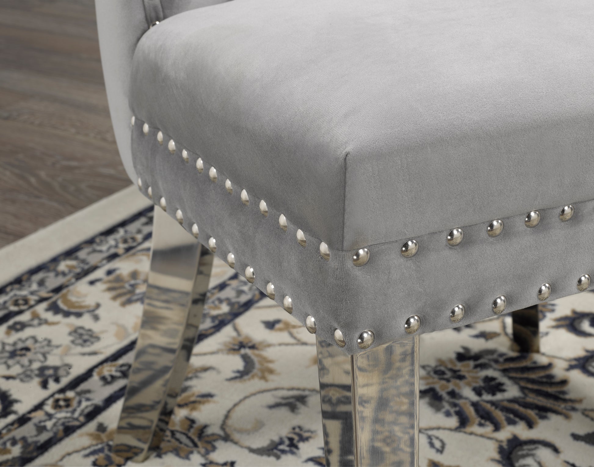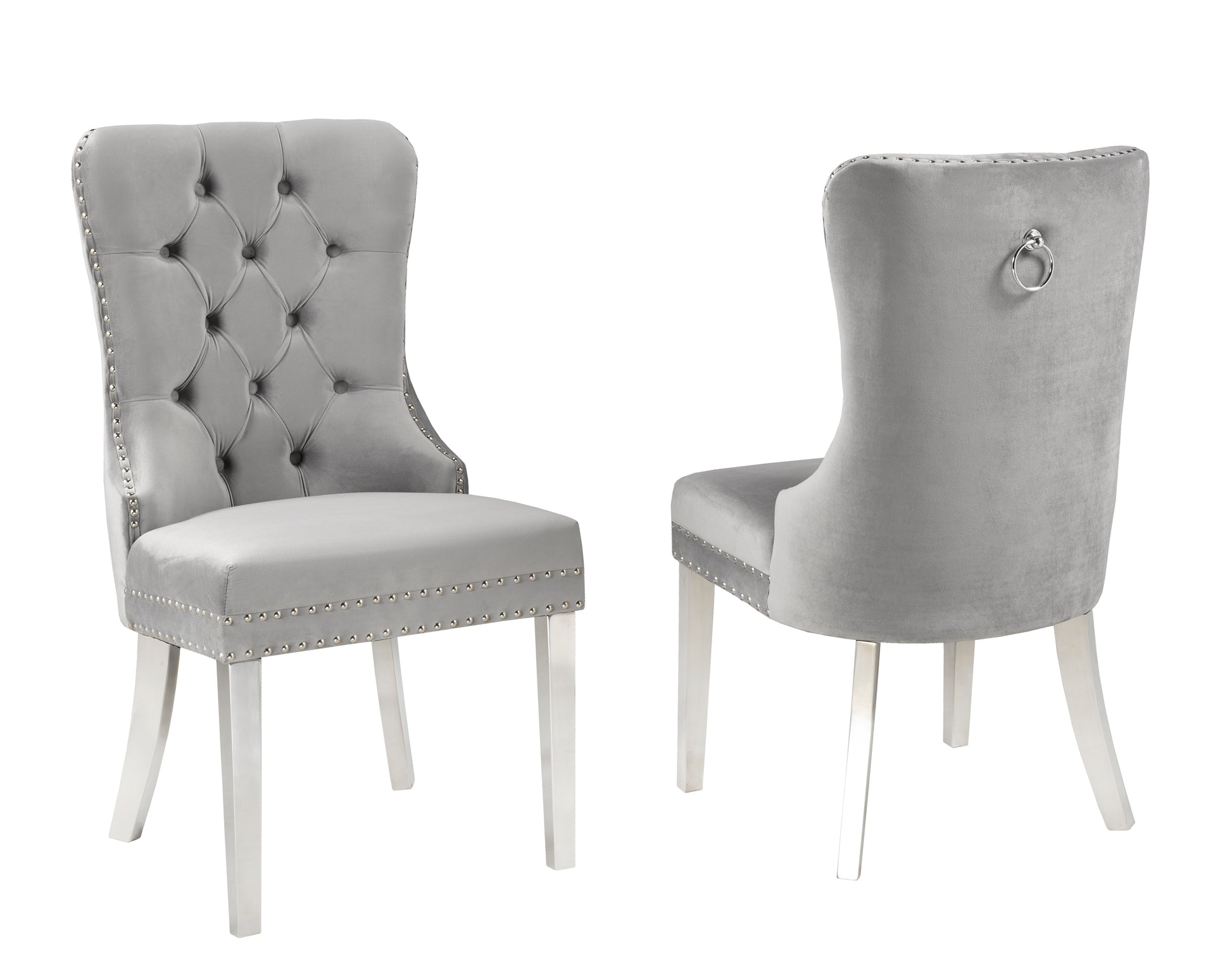 Cet ensemble de 2 chaises de salle à manger est un ajout bienvenu à tout espace de salle à manger chic. Le tissu en polyester élégant mais durable présente une finition veloutée luxueuse pour un look et une sensation invitants. Les accents touffetés traditionnels sur le dossier du siège rembourré sont un beau complément à la garniture à tête de clou sophistiquée et robuste. Une poignée de tirage chromée pratique à l'arrière ajoute un attrait moderne et facilite le repositionnement de cette chaise de salle à manger au besoin. Avec sa couleur à la mode et ses pieds chromés, cette chaise polyvalente s'intègre parfaitement dans n'importe quel décor contemporain ou traditionnel. Regroupez plusieurs chaises de salle à manger autour d'une table ou d'un bar pour créer un ensemble de salle à manger élégant ou placez-les individuellement dans votre maison comme pièces d'appoint ou pour des sièges supplémentaires lors de vos réceptions.