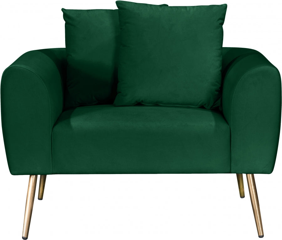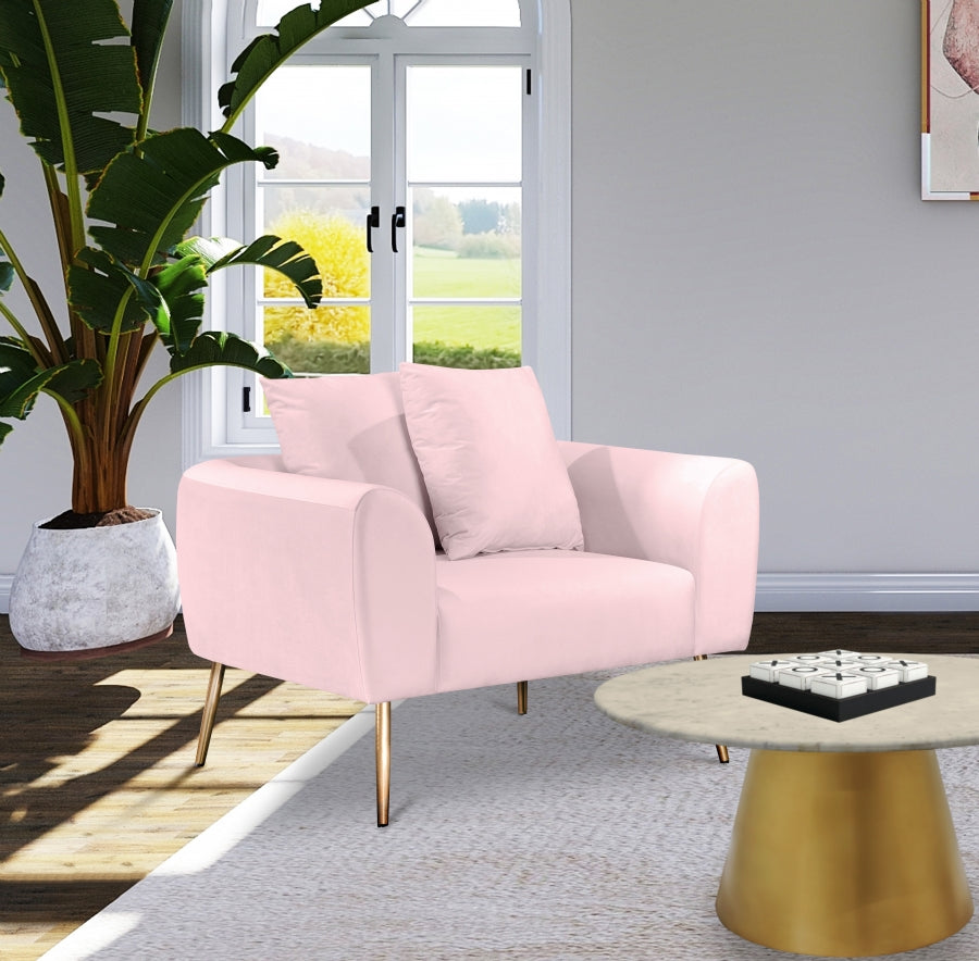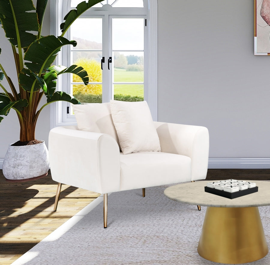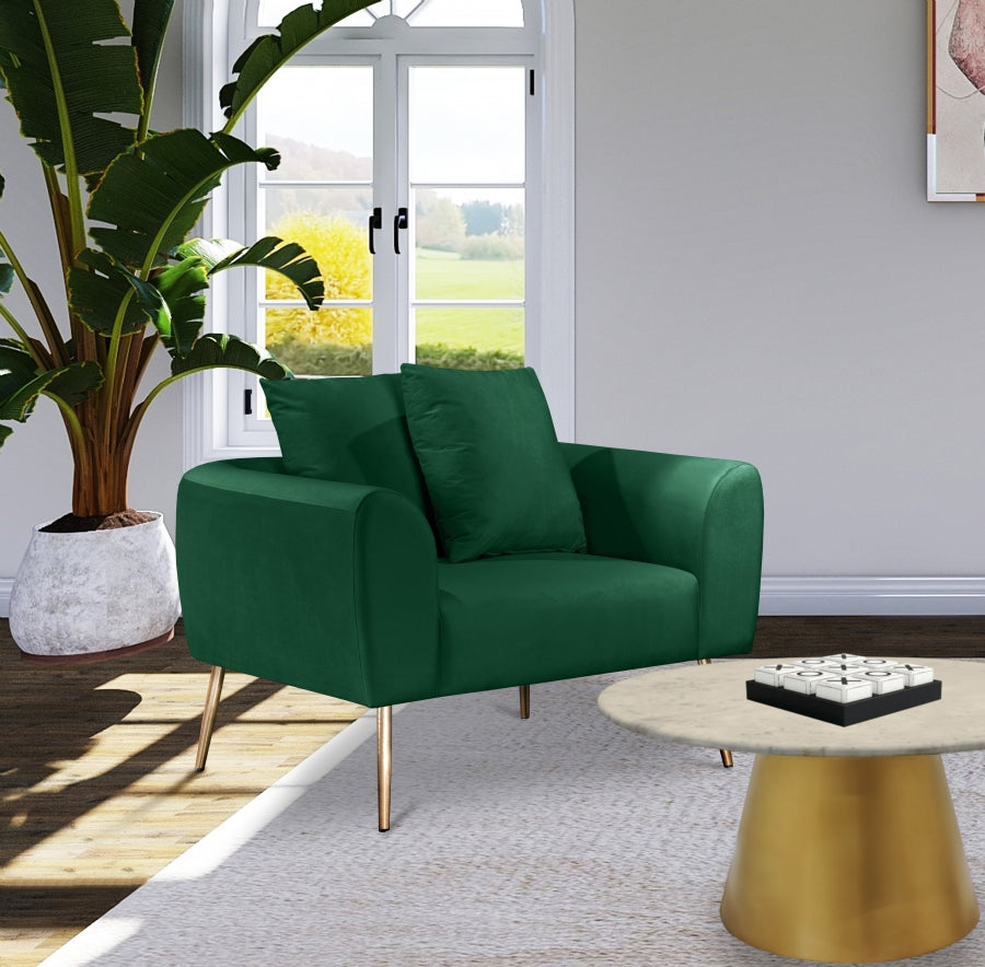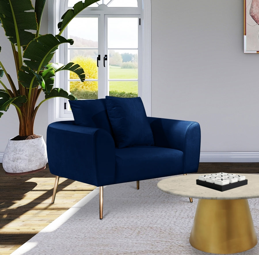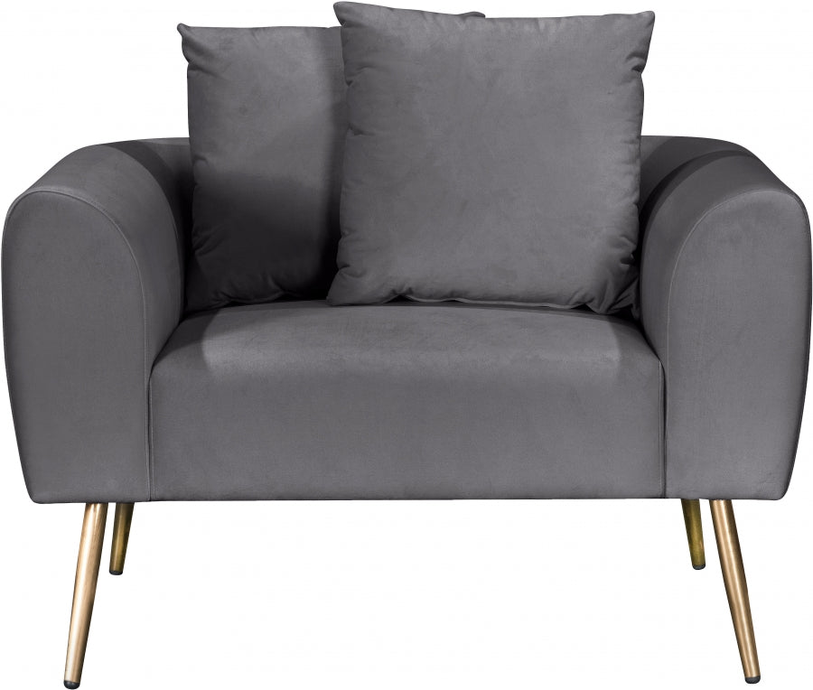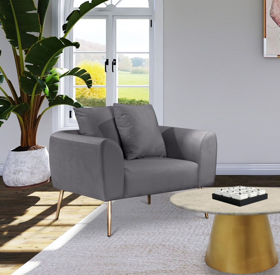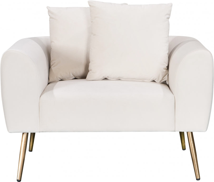 Asseyez-vous dans ce fauteuil en velours Quinn et vous réfléchissez peut-être à deux fois avant de vous relever. Cette chaise super confortable est dotée d'un revêtement en velours doux qui recouvre ses annulations, son siège et son dossier abondamment rembourrés, garantissant qu'il s'agit invariablement du meilleur siège de la maison. Les deux coussins assortis ajoutent à son ambiance accueillante, tandis que les pieds en acier doré rendent le design particulièrement moderne.