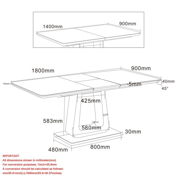 - Verre gris trempé de 5 mm sur le plateau et la plaque de base ; l'extension sans verre crée un aspect bicolore sur le dessus de table