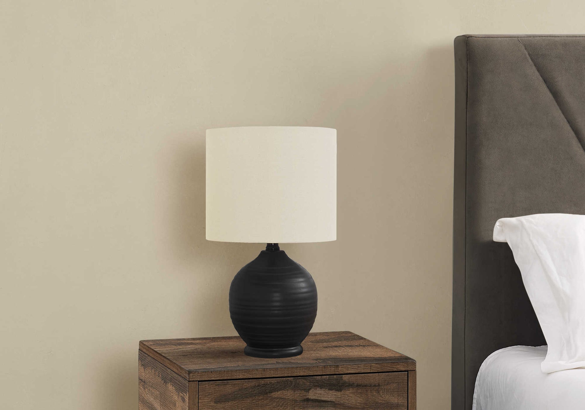 Créez une ambiance intemporelle avec cette lampe de table de style transitionnel de 17 po. Avec une larme arrondie, une base en céramique noire et une finition texturée subtile contrastante avec un abat-jour cylindrique en lin ivoire, cette lampe décorative égayera instantanément votre salon, votre bureau ou votre chambre. Le simple interrupteur rotatif abrite une seule ampoule (non incluse) pour une puissance maximale de 60 W/120 V pour éclairer un espace. Attaché avec un cordon noir de 5 pieds, c'est l'accent fonctionnel parfait à placer sur une table de bout ou d'appoint, une table de nuit ou une table de chevet. Fabriquée avec des matériaux de qualité pour plus de longévité, cette lampe comprend une garantie limitée de 2 ans contre tout défaut de fabrication pour un achat sans souci.
