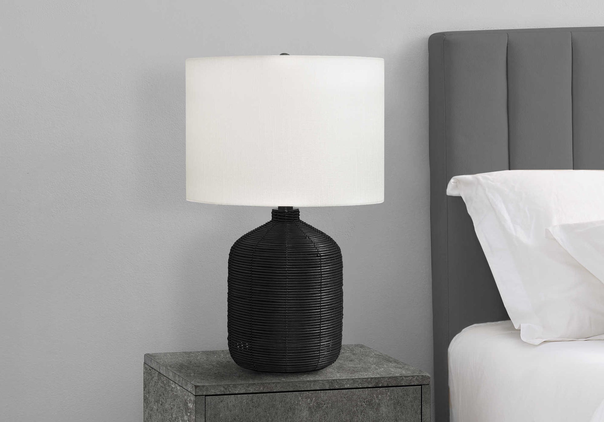 - Apportez une touche décontractée et contemporaine à votre maison avec cette élégante lampe de table de 23 po en forme de pot de gingembre fabriquée en rotin noir sur une structure en métal et surmontée d'un abat-jour tambour moderne en lin ivoire et d'un embout noir.