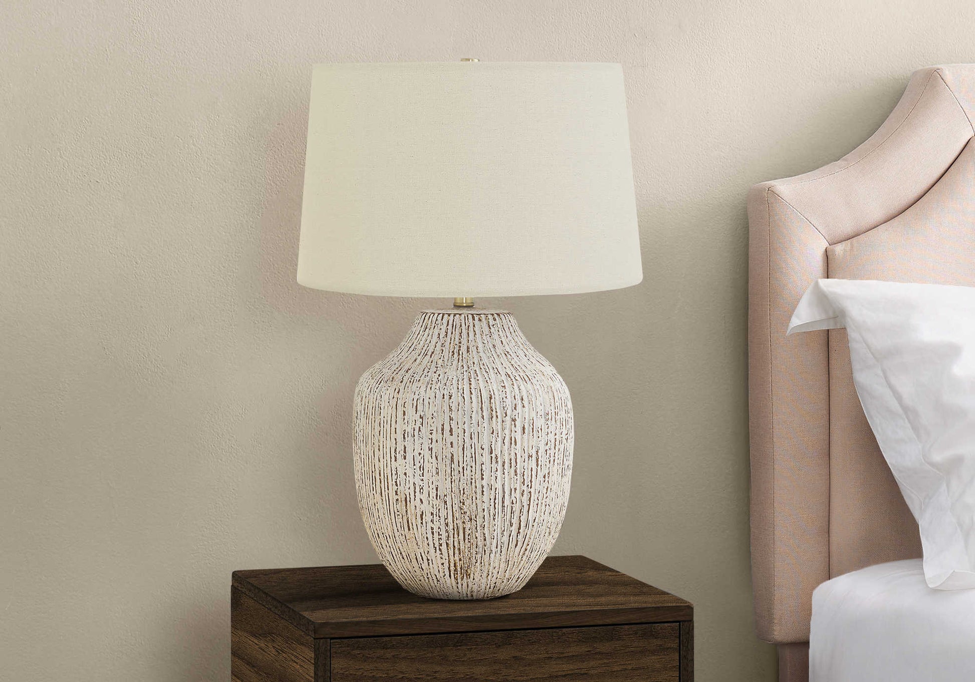 - De style transitionnel avec une forme semblable à un vase, cette lampe de table en céramique crème texturée de 26 po de hauteur, surmontée d'un abat-jour tambour en lin ivoire et finie avec un embout doré sur le dessus, apportera un style tendance et décontracté à n'importe quel salon, chambre ou bureau à domicile. espace.