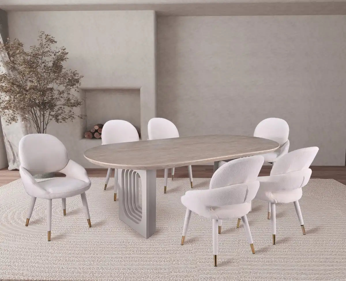 La table se distingue par ses pieds piédestaux saisissants dotés d'un design découpé artistique. Sa finition en peinture mate contrastée rehausse son attrait contemporain, mettant en valeur son imposant plateau de 86,6 pouces. Pour compléter ce chef-d'œuvre, l'ensemble inclut six chaises élégamment rembourrées. Avec leurs dossiers incurvés et leur assise moelleuse, ces chaises offrent un soutien ergonomique supérieur. Enveloppées d'un tissu texturé doux au ton beige, elles créent une atmosphère chaleureuse et lumineuse, idéale pour les repas quotidiens comme pour les grands rassemblements.