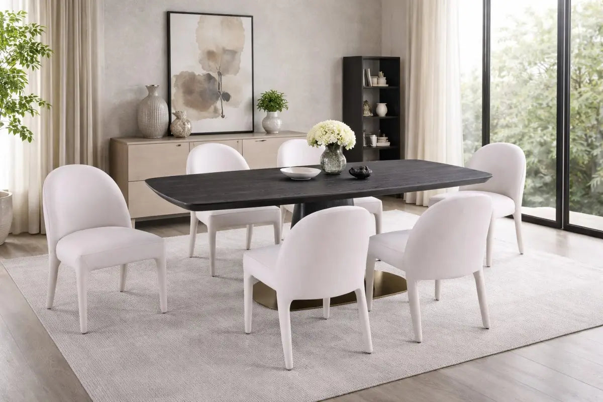 Une esthétique moderne raffinée aux lignes sculpturales. L'ensemble de salle à manger 7 pièces Ryaan en noir et beige est l'équilibre parfait entre l'audace architecturale et la simplicité minimaliste. Cet ensemble n'est pas qu'un simple mobilier, c'est une pièce maîtresse conçue pour ceux qui apprécient les intérieurs sophistiqués et chaleureux.