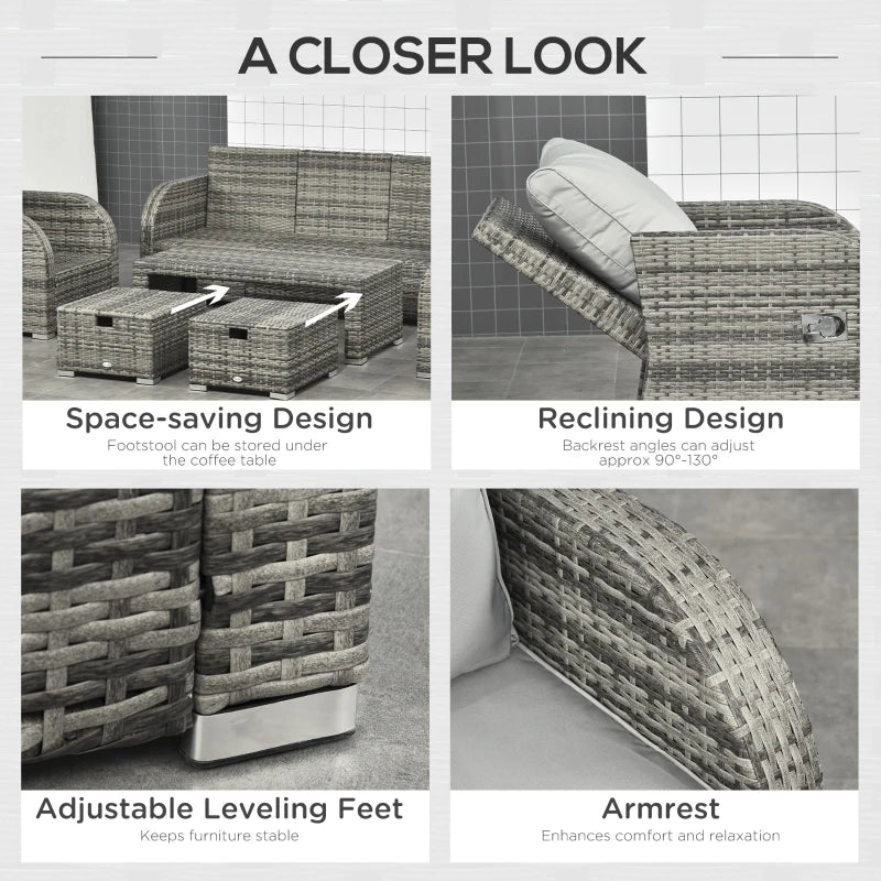 Ensemble de meubles de patio 6 pièces, ensemble de conversation en osier, canapé 3 places rembourrés en rotin, 2 fauteuils inclinables réglables, 2 repose-pieds et table pour pelouse, jardin, arrière-cour, gris clair