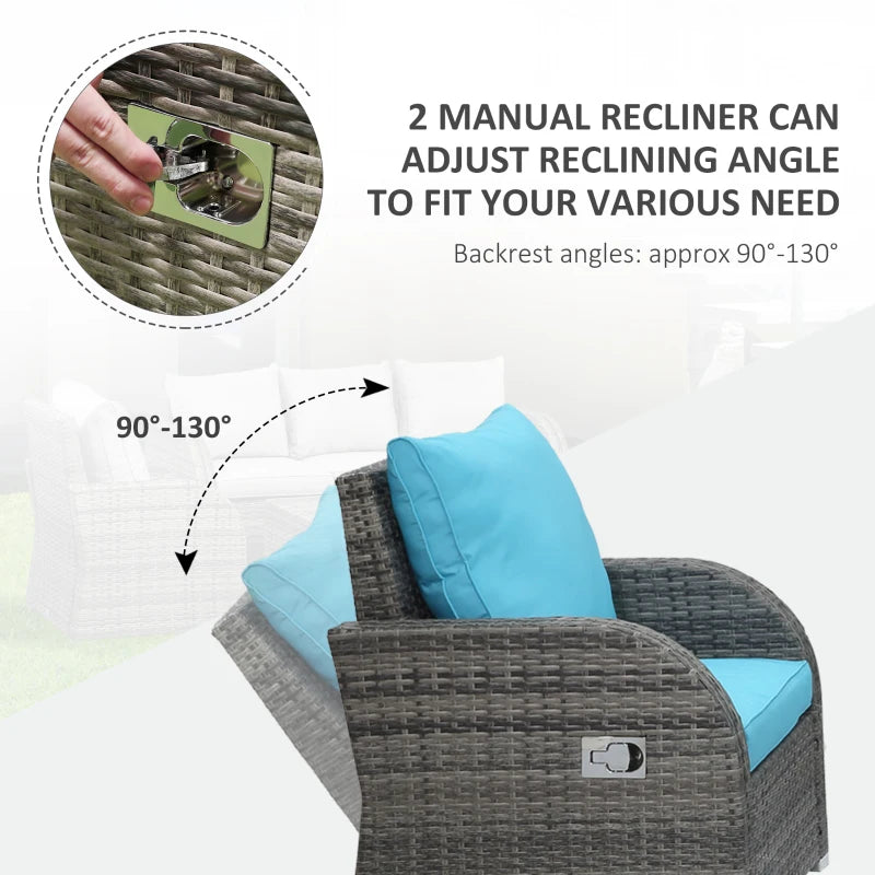 Ensemble de meubles de patio 6 pièces, ensemble de conversation en osier, canapé 3 places rembourrés en rotin, 2 fauteuils inclinables réglables, 2 repose-pieds et table pour pelouse, jardin, jardin, bleu ciel