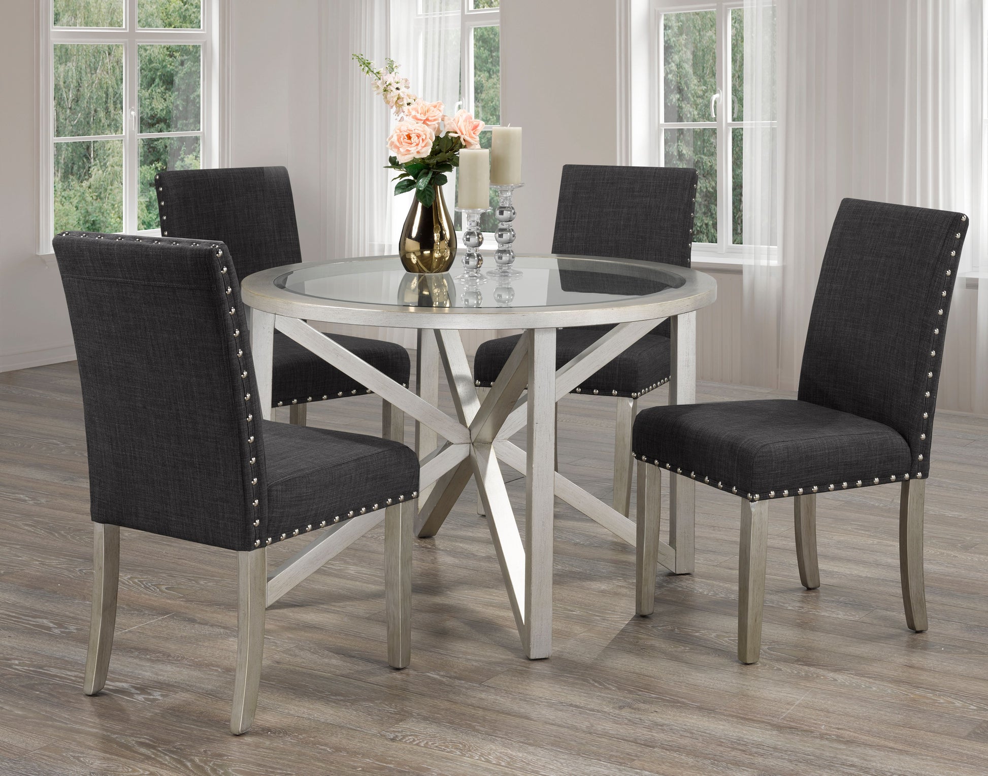 La série de salle à manger Bella vous aide à créer un espace de salle à manger élégant bien adapté à tout intérieur moderne. Les chaises et la base de table robustes sont fabriquées à partir de bois massif et de placage de bouleau pour un style et une durabilité durables. Savourez des repas familiaux décontractés ou des dîners élégants dans le confort, grâce aux sièges rembourrés et aux dossiers hauts légèrement incurvés des chaises. Une belle garniture cloutée ajoute une touche de finition sophistiquée au tissu gris clair polyvalent. La table de salle à manger de cette série comprend une base de table en bois solide qui se coordonne avec les pieds de la chaise et un plateau en verre raffiné élégant qui est durable et facile à nettoyer. Cette série a un look contemporain audacieux mais neutre qui peut facilement ancrer une pièce sans la submerger.