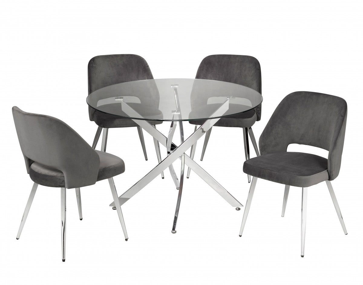 L'apparence élégante et élégante de l'ensemble de salle à manger Elise rehaussera instantanément l'intérieur de votre salle à manger. Dotée d'une table élégante et unique avec un plateau rond en verre trempé de 12 mm et une base chromée argentée brillante, cette table reflète l'art raffiné du style contemporain. La table à manger est associée à quatre chaises de jais mettant en valeur un dossier profilé pour un soutien optimal. Le riche rembourrage est équilibré sur des pieds effilés au fini chromé brillant, ce qui le fait ressortir même de loin. Qu'il s'agisse de votre salle à manger ou de votre cuisine, cet ensemble minimaliste de cinq pièces avec une palette de couleurs monochromes se fondra dans n'importe quel arrière-plan.