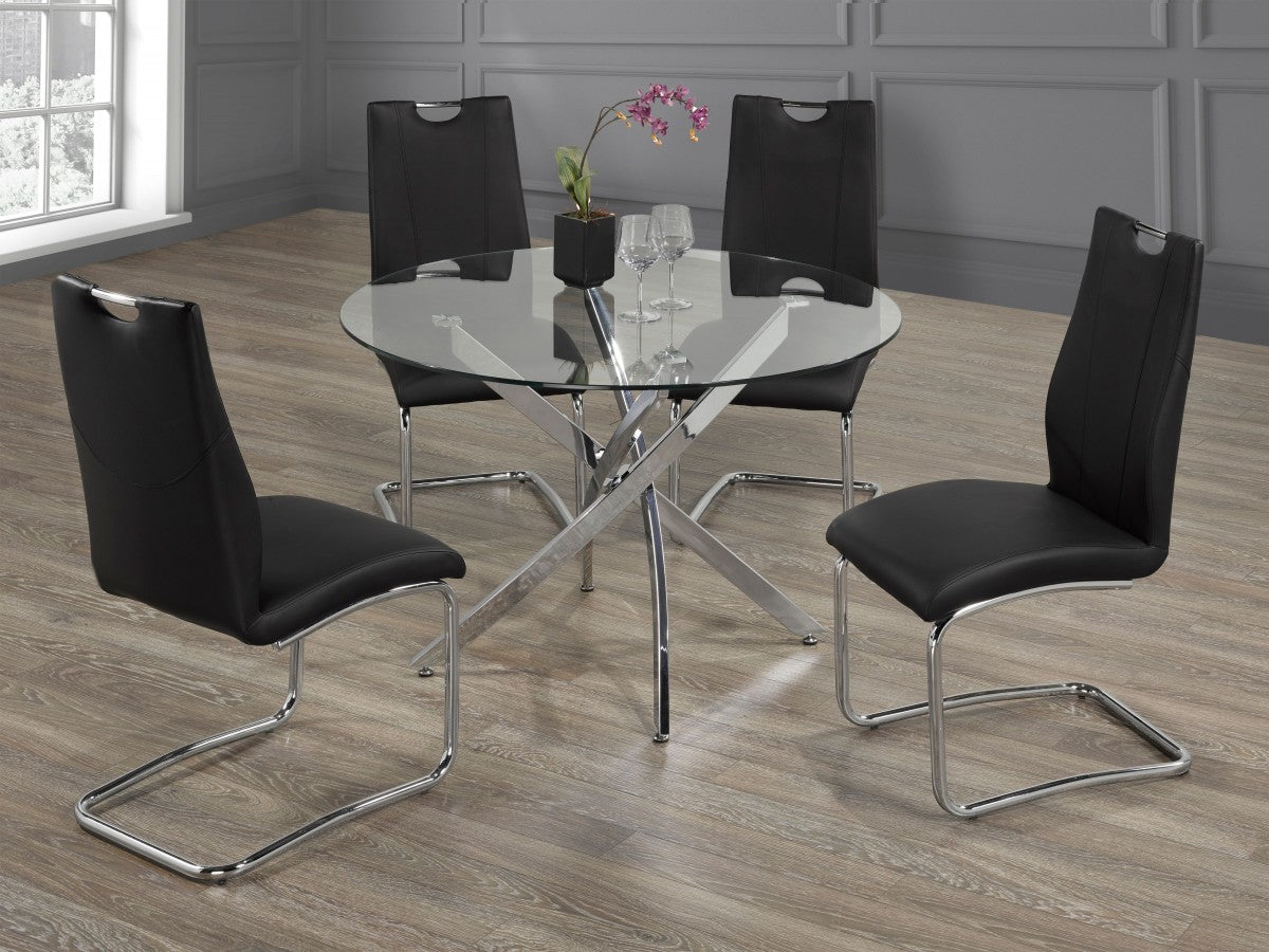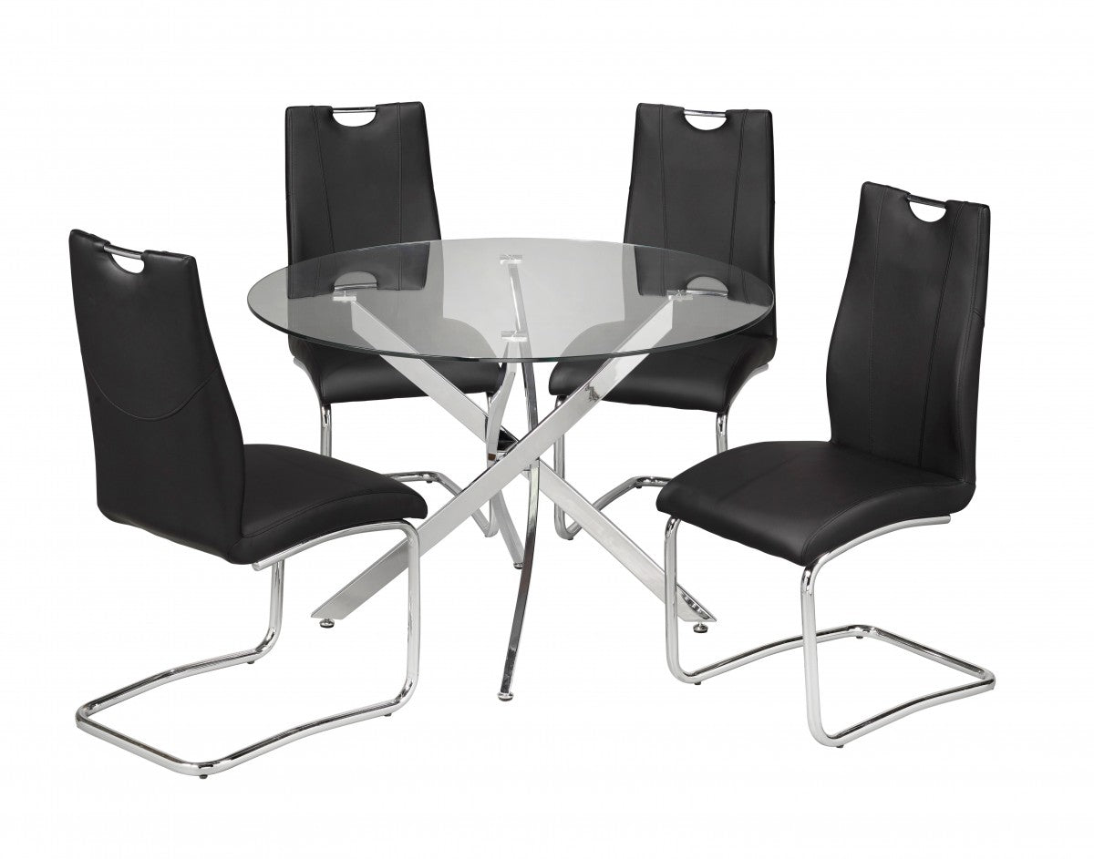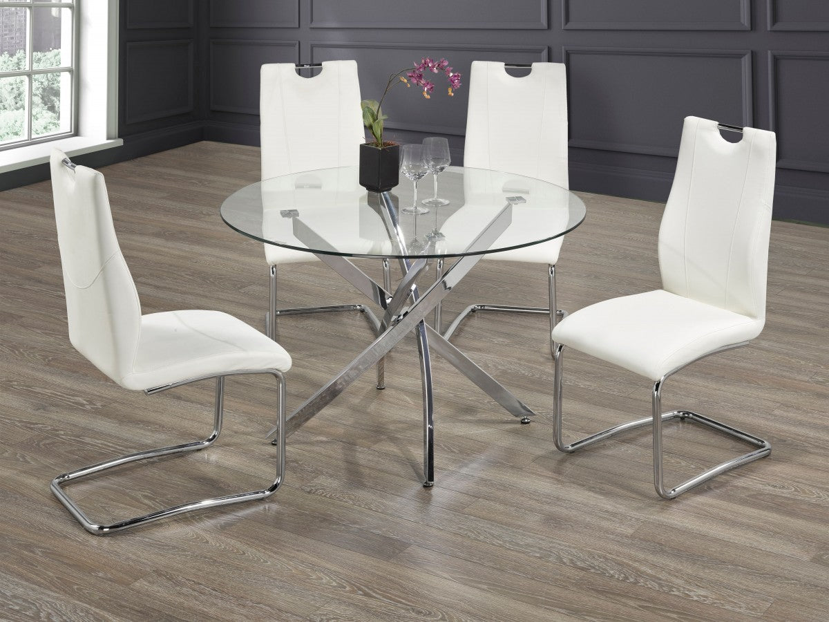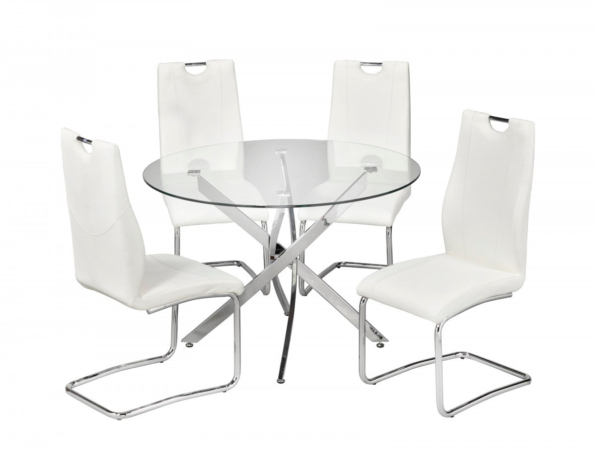 Parfait pour un espace de salle à manger ouvert, cet ensemble de salle à manger Elizette aux lignes épurées dégage une essence moderne du milieu du siècle dans la salle à manger. La palette de couleurs neutres et douces de cet ensemble de salle à manger de cinq pièces avec une ornementation minimale met l'accent sur la simplicité. Le raffinement subtil de cette table ronde au plateau de verre évasé sur un piètement chromé brillant offre un aspect tendance et léger pour une expérience culinaire confortable. Le revêtement de la chaise est doté d'un tissu riche et le dossier incurvé perché sur des pieds en forme de U au fini chromé assurera la stabilité tout en rehaussant l'esthétique de votre salle à manger. Si vous voulez quelque chose qui non seulement accentue l'élégance de l'ère moderne, mais qui se démarque par sa fonctionnalité et sa durabilité, alors cet ensemble de salle à manger est fait pour vous.