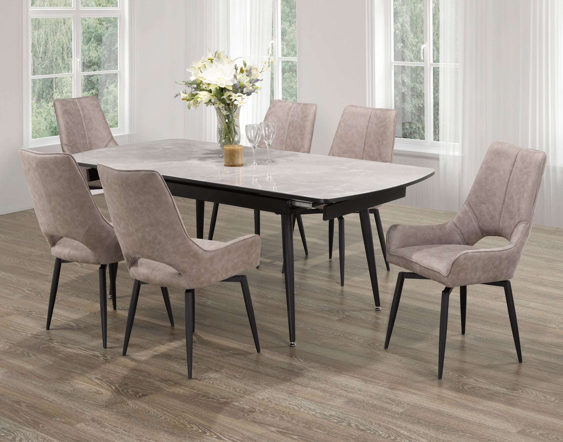 • Comprend une table et 4 chaises || Comprend une table et 6 chaises• Dessus de table sur une toile grise avec des veines en cascade