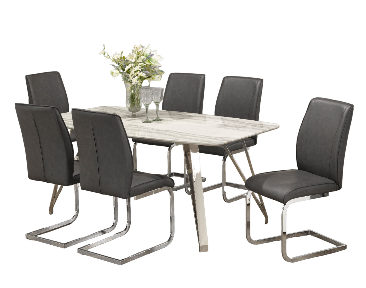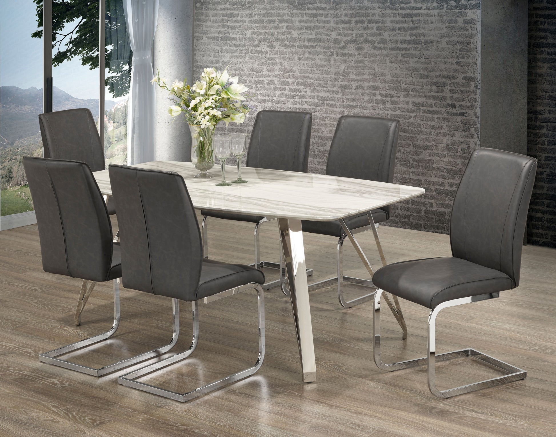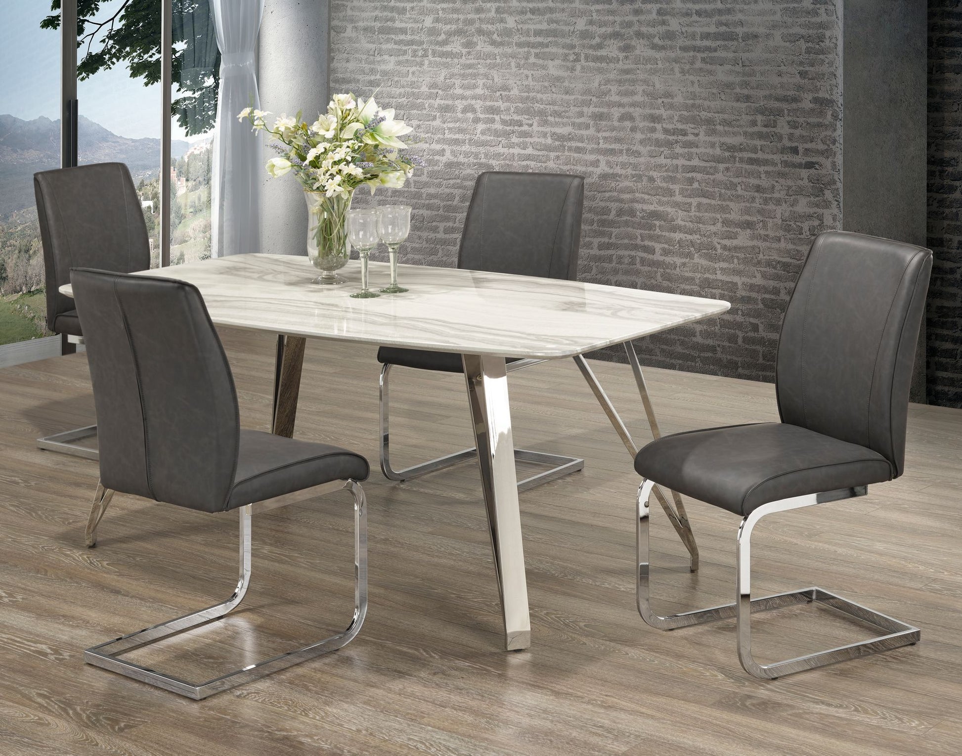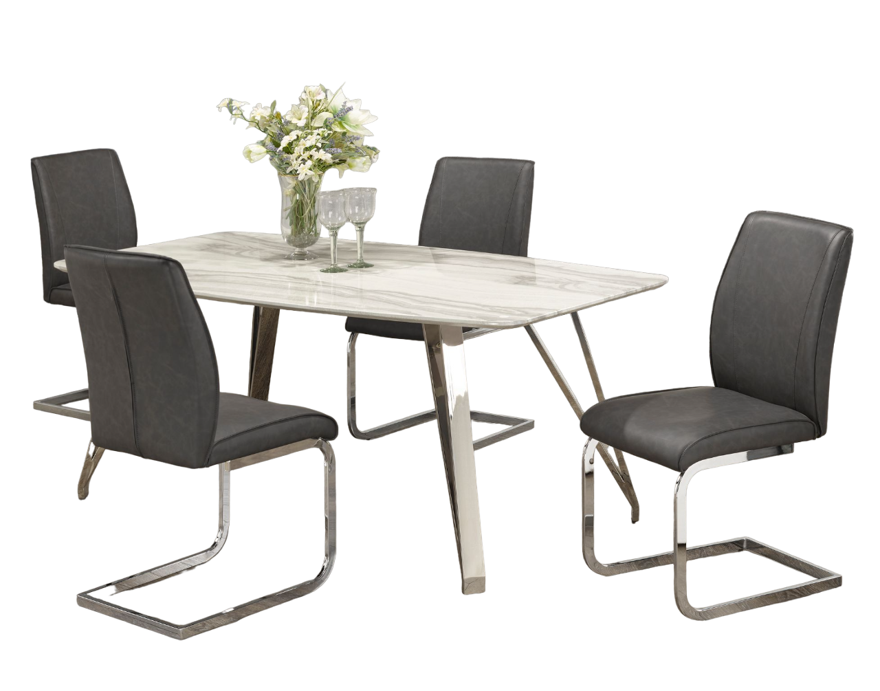 L'ensemble de table à manger Elliott accentue un design contemporain ponctuant une essence industrielle nette. Cet ensemble de salle à manger de cinq pièces comprend une table spacieuse et quatre chaises modernes aux lignes épurées qui ne manqueront pas d'attirer l'attention de vos invités. Doté d'une table en faux marbre blanc avec des motifs gris complexes soutenus par des pieds évasés dans une finition chromée argentée. Associé à des chaises soutenant une housse en tissu de qualité supérieure gris anthracite finement rembourrée et rembourrée avec un dossier légèrement incliné vers l'intérieur pour un confort accru. Les pieds robustes en forme de U chromés contribuent non seulement au design, mais offrent également une stabilité optimale. Pour un agencement minimaliste, les chaises peuvent être glissées sans effort sous la table pour économiser de l'espace'elles ne sont pas utilisées.