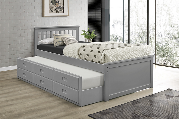 Comprend un lit gigogne coulissant et 3 tiroirs coulissants