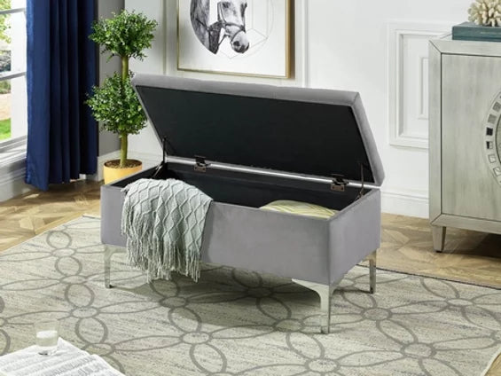 Banc de rangement en velours gris avec capitonnage profond et pieds chromés