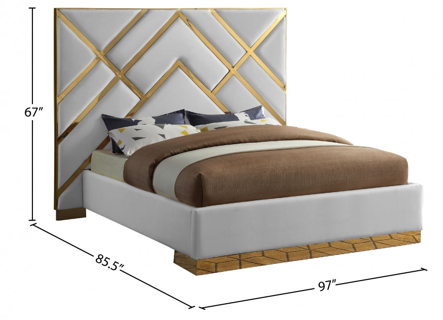Amenez l'espace de votre chambre à coucher à un tout nouveau niveau de modernité avec ce lit en velours blanc Vector. Le revêtement en velours chic d'une belle couleur blanche est entrecoupé de métal doré poli dans un design géométrique qui n'est rien de moins que spectaculaire. Ce superbe lit est doté d'un piètement en métal doré pour parfaire la présentation sur une note glamour et haut de gamme. Des lattes pleines sont incluses avec le lit pour aider à soutenir votre matelas, et l'empreinte de la plate-forme garantit que vous n'avez pas besoin de sommiers à ressorts ou de fondations pour recréer ce look à la maison.