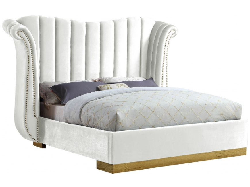 Faites une déclaration dramatique tout en acceptant une touche contemporaine dans la chambre à coucher avec ce lit en velours Flora à couper le souffle. Dotée d'une base en métal doré recouverte d'un riche velours blanc avec des accents cloutés dorés et un capitonnage canal le long de la tête de lit, ce lit galant attiréa à coup sûr l'attention de peut entrera dans votre chambre à coucher . Son design contemporain à oreilles ajoute une présence royale à votre espace de couchage, tandis que sa taille généreuse vous assure de dormir comme un roi.