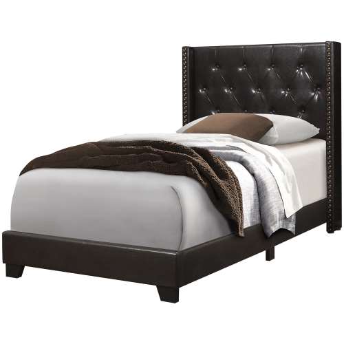 Donnez à votre chambre une apparence de maître avec ce luxueux cadre de lit simple avec une tête de lit à oreilles recouverte d'un tissu sophistiqué d'apparence cuir brun foncé. Le style contemporain classique de cette tête de lit jusqu'au sol, soulignée d'une garniture à têtes de clous en laiton sur les côtés et d'un capitonnage en losange rembourré, présente au lit une touche discrète. Les lignes épurées des côtés rembourrés et du cadre avant ainsi que les pieds en bois massif noir, légèrement inclinées à l'avant, ajoutent de la stabilité à l'ensemble du cadre de lit. Le sommier et le matelas ne sont pas inclus et doivent être achetés séparément. Toutes les pièces et le matériel pour l'assemblage sont inclus.