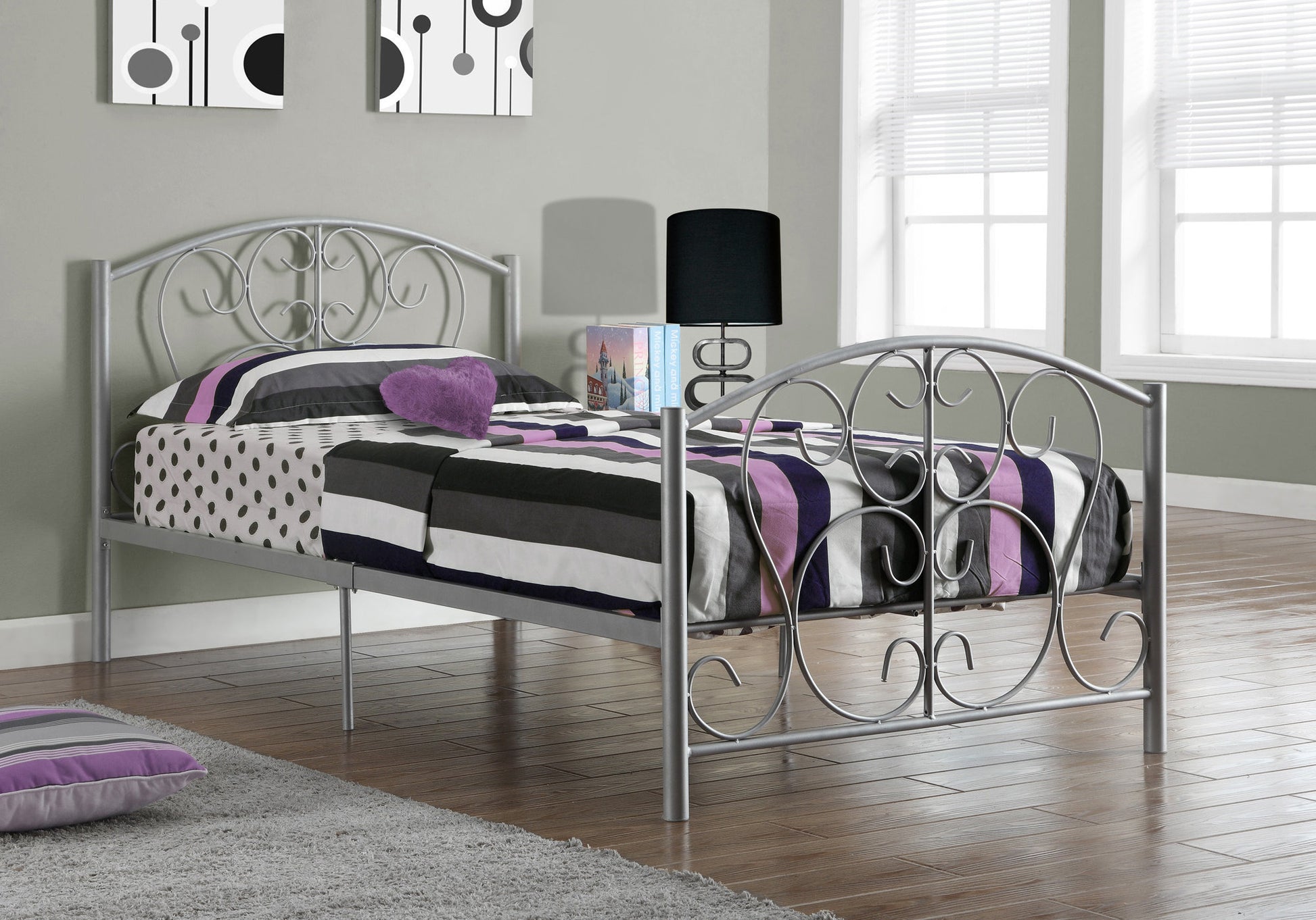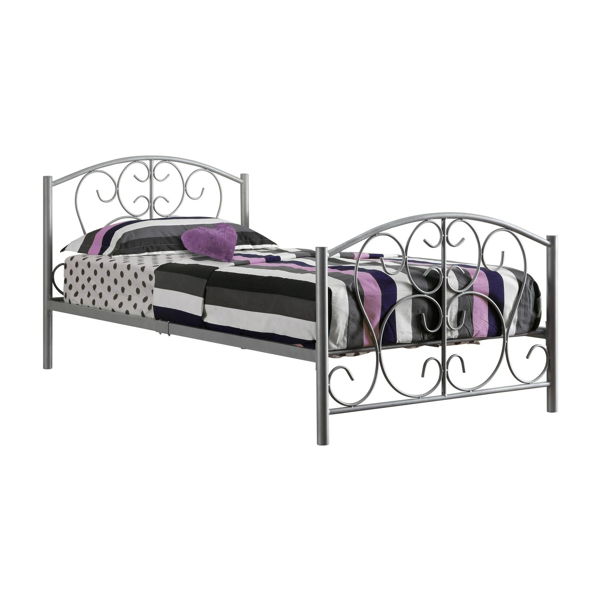 Ce cadre de lit simple en métal sera un bel ajout à n'importe quelle chambre à coucher. Les courbes délicates combinées à une finition argentée moderne font de ce lit le point central de tout décor ! Solidement intégré avec des pieds en métal de 2 po et un support de matelas suffisant, ce lit ne nécessite pas de sommier. Un assemblage est requis.