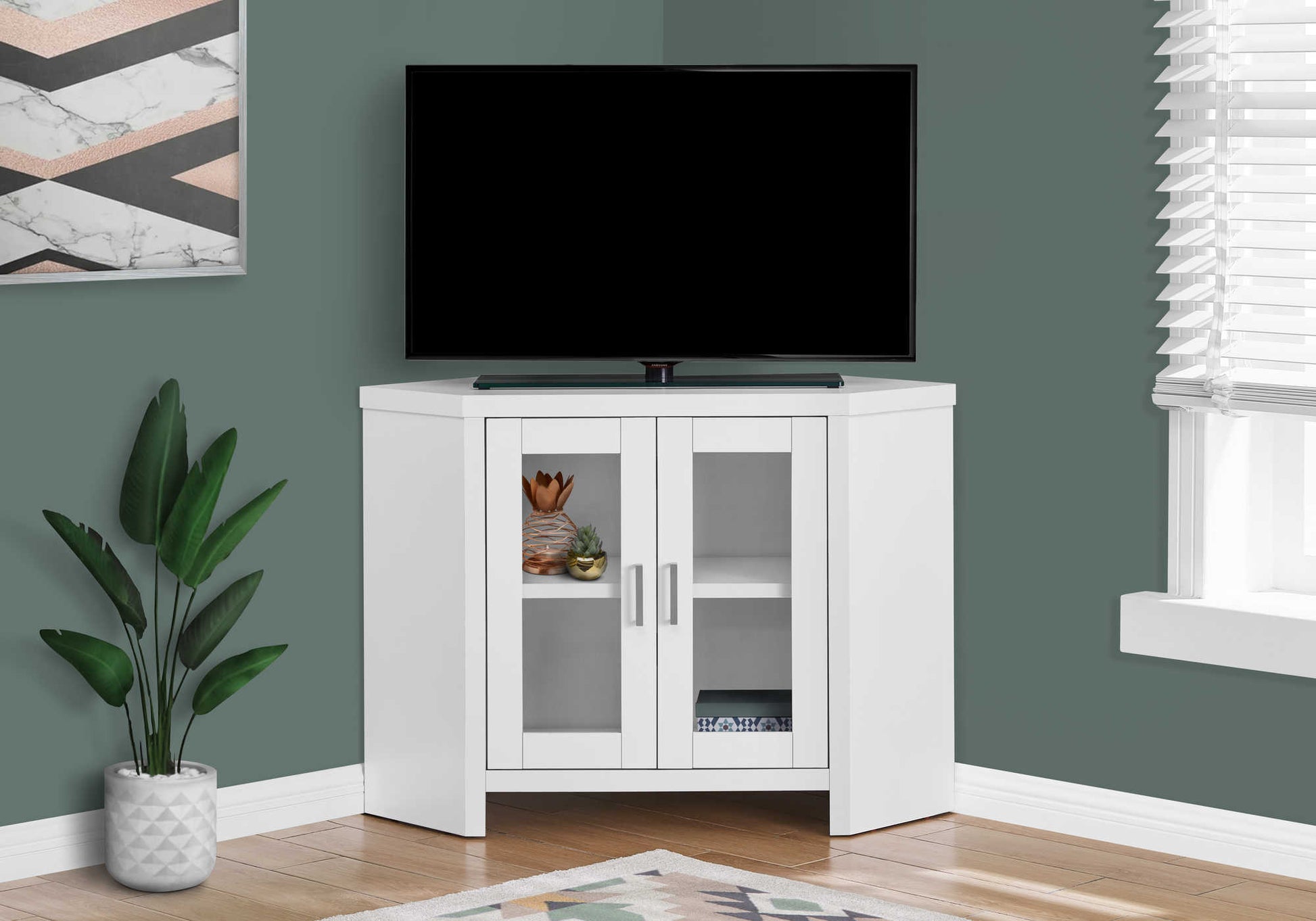 MEUBLE TV - 42"L / EN COIN BLANC AVEC PORTES VITRÉES( Meuble Mtl )