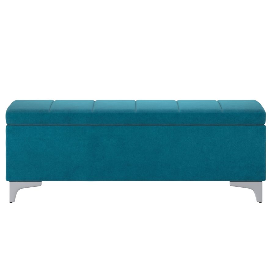 Ce banc de rangement élégant et à grande échelle est la solution parfaite pour garder l'encombrement à distance et être joli en même temps. Le rembourrage super doux est accentué avec des détails de couture et fini avec des pieds en métal chromé robustes. Le dessus pivotant a une charnière de sécurité pour qu'il ne se réfère pas sur les petits (ou les gros) doigts. Une belle pièce à ajouter au salon ou dans la chambre au bout du lit.