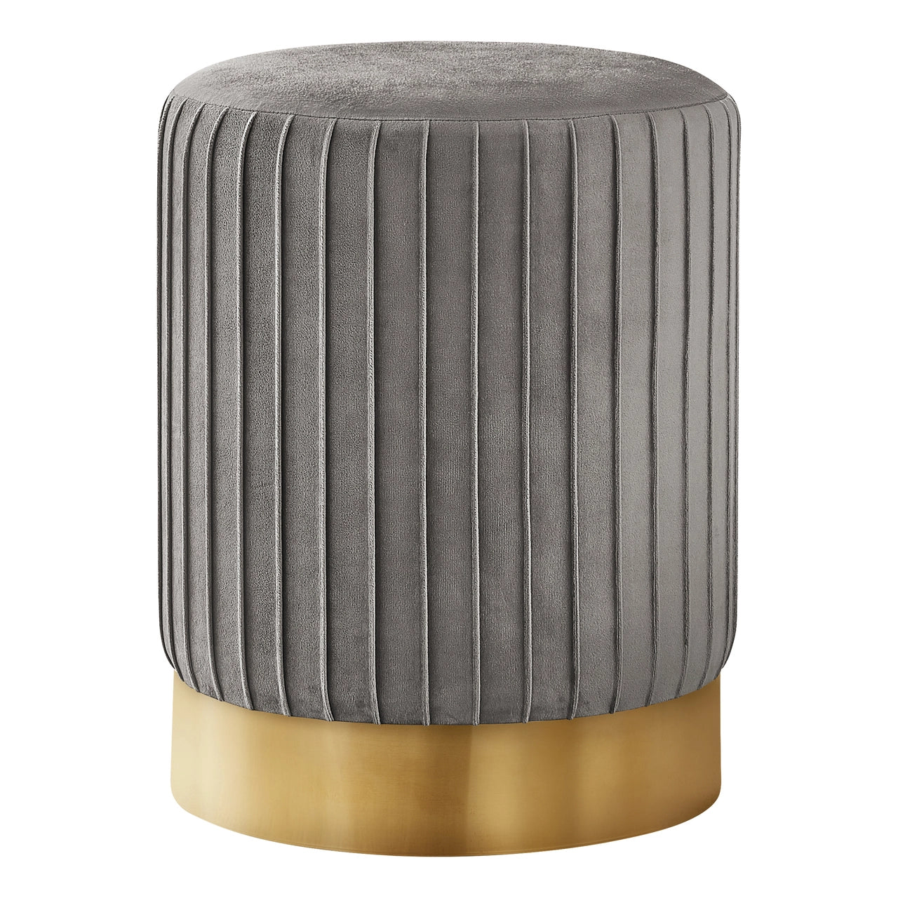 Ce pouf exceptionnel attire l'attention avec sa forme cylindrique unique et ses détails distinctifs. Recouvert d'un tissu de velours gris au toucher luxueux, les côtés hauts sont plissés pour un attrait visuel et textuel tandis que le siège rembourré est lisse pour offrir un confort supérieur. Une base en métal robuste au fini doré brillant complète le look glamour moderne. Aussi polyvalent que chic, ce pouf rond est idéal dans un salon ou une chambre comme repos-pieds pour reposer vos pieds et comme table de fortune pour placer un livre ou un appareil mobile, ou comme pouf où et quand vous avez besoin d'un siège supplémentaire.