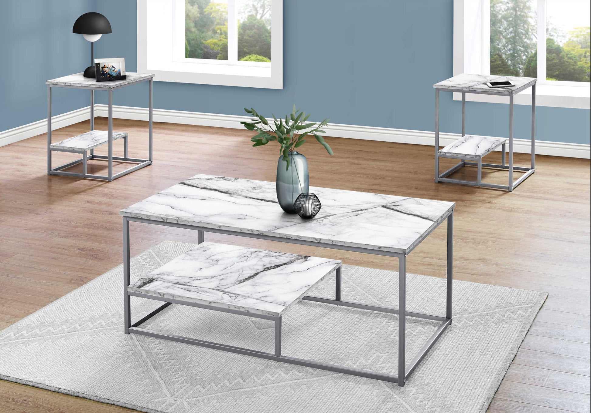 Apportez une mise à jour moderne et fraîche à votre espace de vie avec cet ensemble de table basse unique de 3 pièces. Le design contemporain simple dans une finition chic d'aspect marbre blanc et accentué d'une garniture en métal argenté, offre un plateau de table spacieux avec une demi-étagère inférieure surélevée pour un rangement et une présentation supplémentaires. Les tables d'appoint assorties sont parfaites pour placer une lampe, des images ou d'autres objets décoratifs tandis que la table basse sera un point focal attrayant dans votre salon, tanière ou salle familiale.