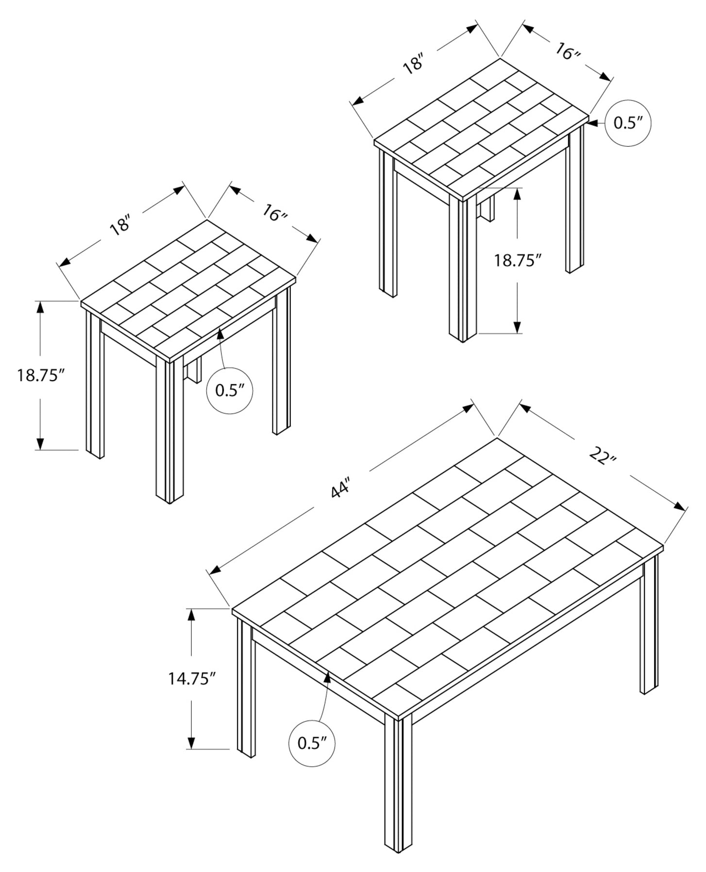 - Dimensions du produit (table basse) : 44 pouces L x 22 pouces lx 15 pouces H ; 18 pouces L x 16 pouces L x 19 pouces H (tables de bout)