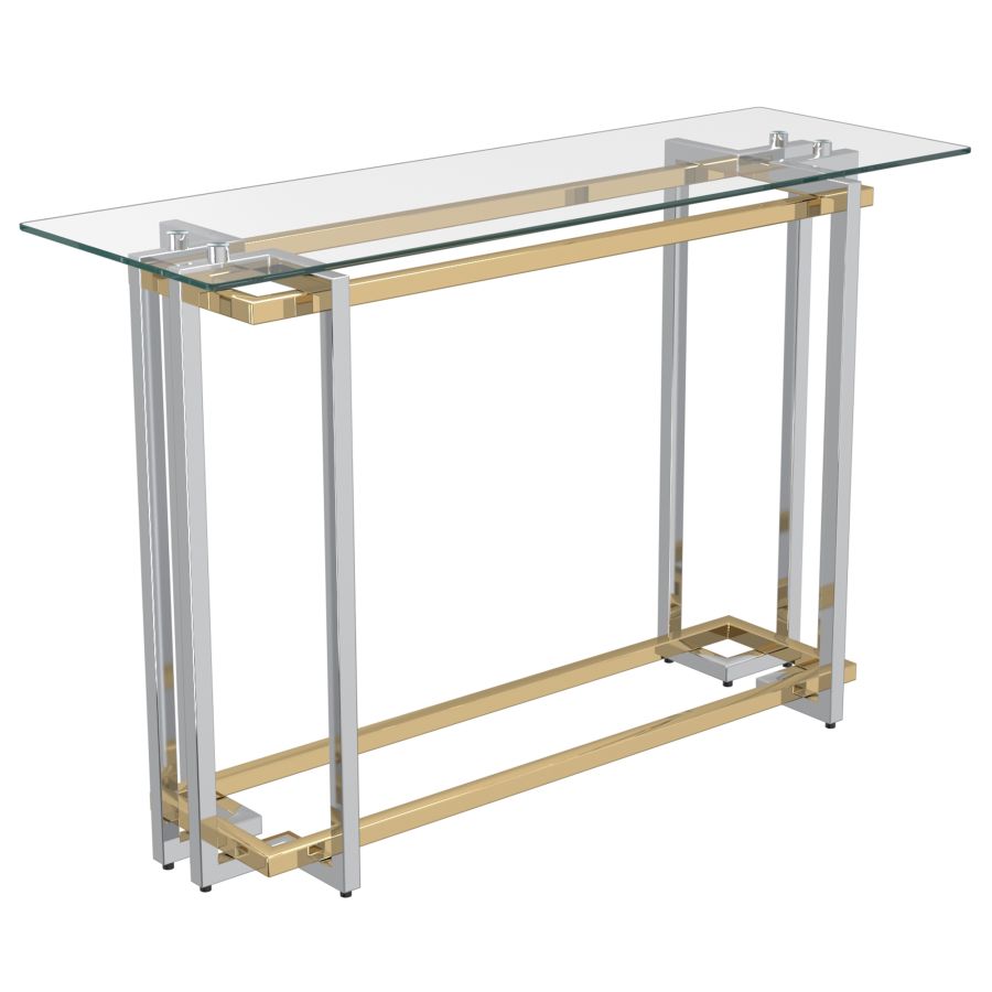 Table console contemporaine élégante en métal et verre avec une finition entrelacée d'or et d'argent. Le design géométrique et le plateau en verre confèrent à cette pièce un aspect aéré qui ajoute une fonctionnalité de beauté et sans être envahissant. Idéal comme pièce d'appoint derrière un canapé, dans un couloir ou une salle d'eau.