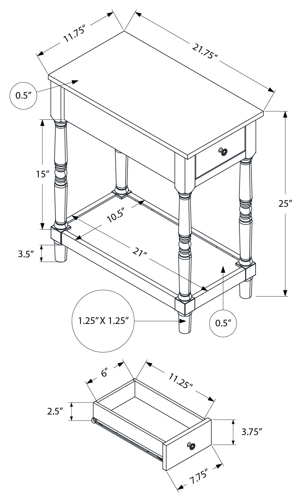 Cette table d'appoint tendance et pratique de 25 pouces de hauteur est une pièce incontournable pour votre maison. Avec un design peu encombrant, cette table d'appoint à 2 niveaux est parfaite pour les petits espaces grâce à son profil étroit à placer à côté d'un fauteuil ou d'un canapé dans un salon avec une petite lampe sur le dessus, ou comme table de nuit dans la chambre. La finition en placage brun chaud avec de minces pieds pivotants ajoute une touche d'élégance traditionnelle à n'importe quelle pièce, tandis que le tiroir de rangement et la tablette inférieure vous permettent de garder facilement vos essentiels à portée de main. Conçue de manière durable avec des matériaux de qualité pour résister à une utilisation quotidienne avec un plateau facile à nettoyer, cette table de bout bénéficie d'une garantie limitée de 5 ans contre les défauts de fabrication pour votre commodité. Facile à assembler avec des instructions illustrées, toute la quincaillerie et les protections de sol incluses pour que vous puissiez avoir cette table d'appoint polyvalente et prête à en profiter.