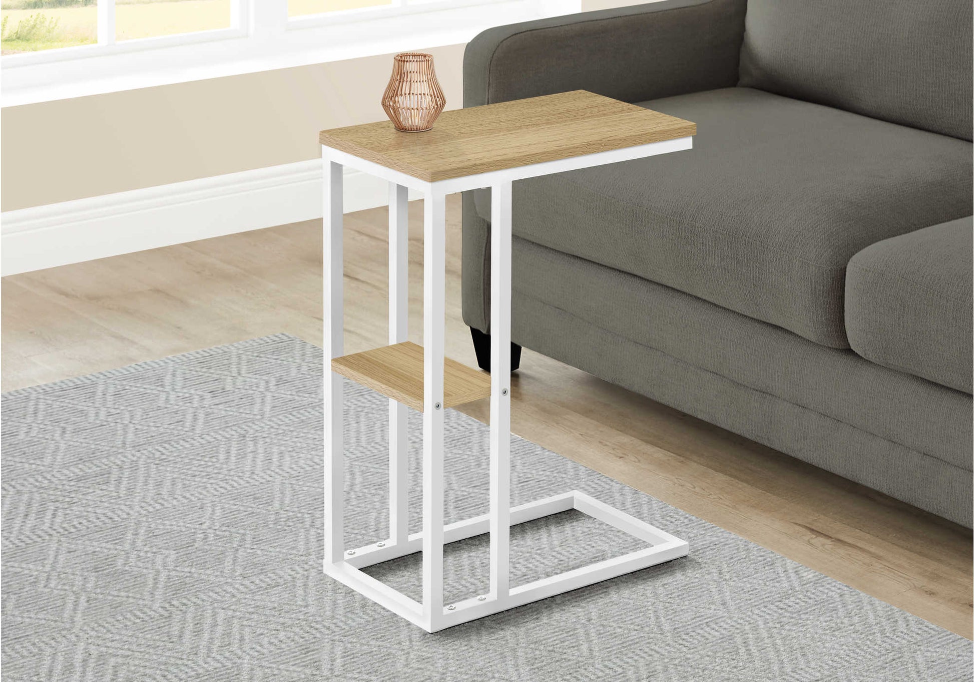 Des lignes droites et des angles épurés confèrent à cette table d'appoint en forme de C un look élégamment moderne. Le dessus de table rectangulaire dans une finition d'aspect bois naturel est soutenu par un cadre en métal blanc avec une étagère secondaire sous la table pour un placement pratique des petits articles. Faites glisser cette table d'appoint polyvalente sous un canapé ou une chaise pour placer des collations ou des appareils mobiles ou utilisez-la comme table d'appoint à côté d'un lit.