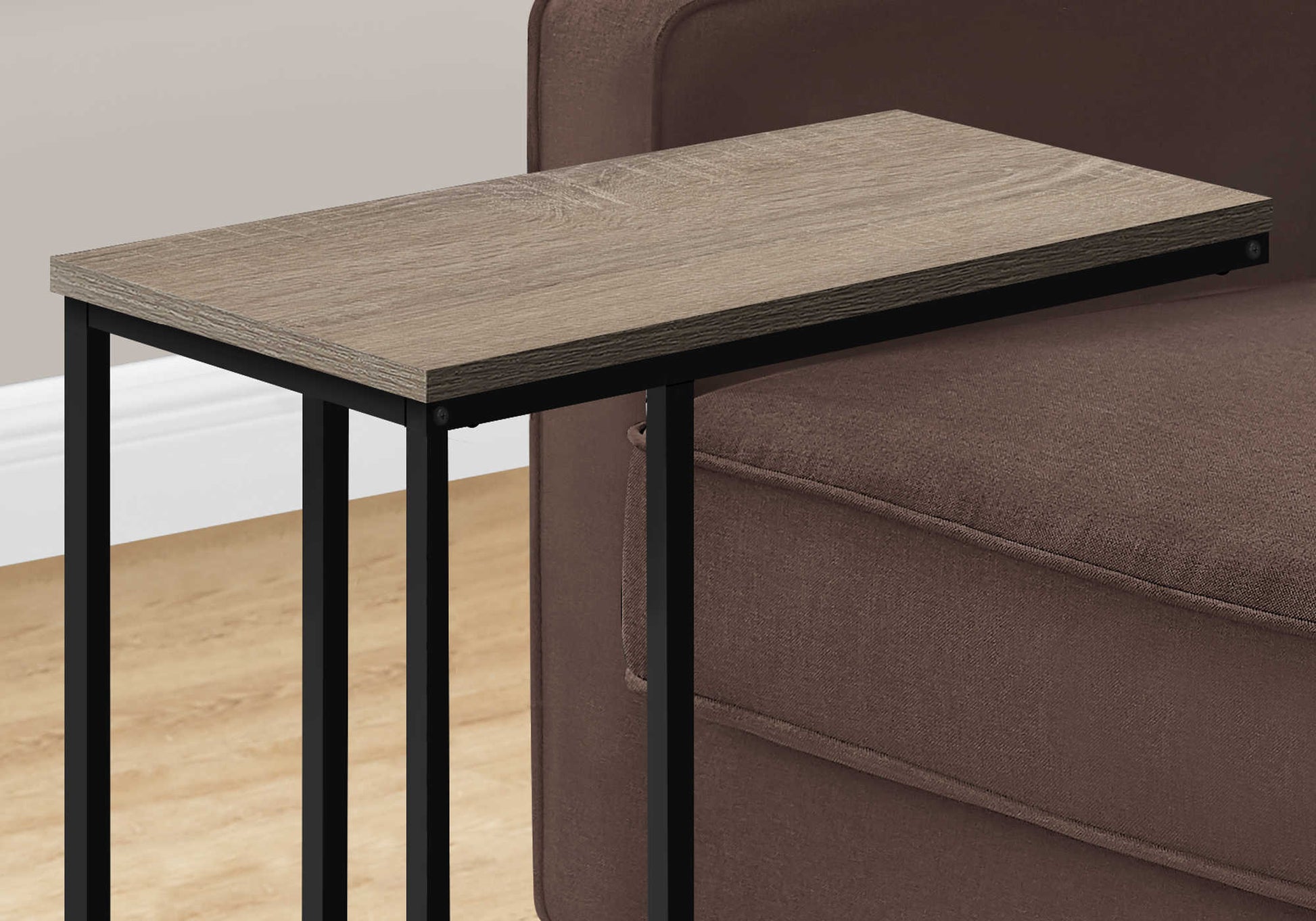 - Avec une surface d'aspect bois taupe foncé lisse et tendance, cette table d'appoint en forme de C se glisse facilement sous votre canapé, votre chaise ou votre lit et repose légèrement au-dessus du sol pour éviter d'endommager votre sol.