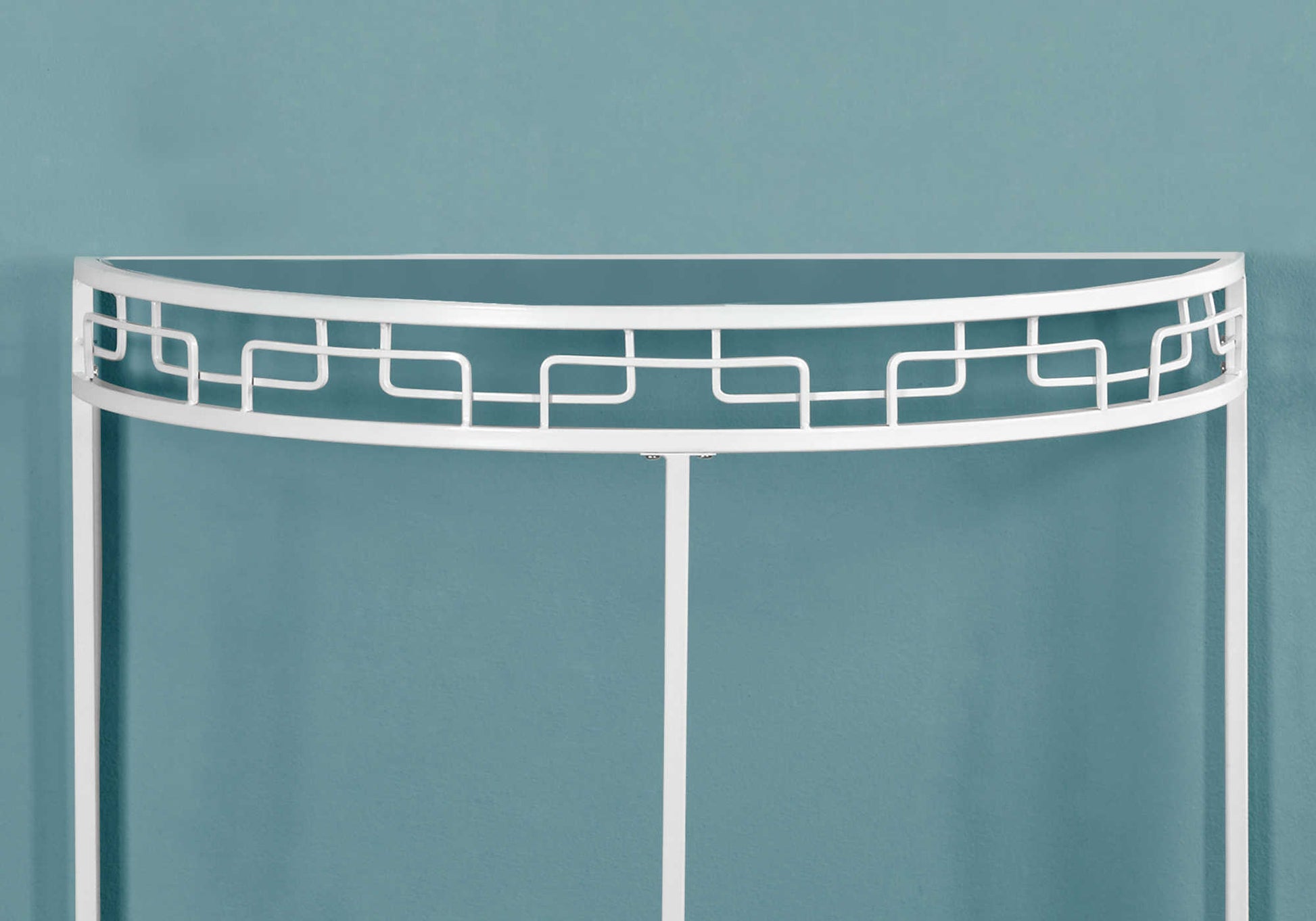 Accueillez vos invités avec style avec une console en métal en forme de demi-lune qui sera du plus bel effet comme console d'entrée ou dans votre salon. Idéale dans les petites maisons, les condos ou les appartements, cette table d'appoint est délicatement conçue dans un cadre en métal blanc avec un plateau en verre trempé épais avec suffisamment d'espace pour votre décor ou d'autres accessoires. Le dessin géométrique ressort parfaitement.