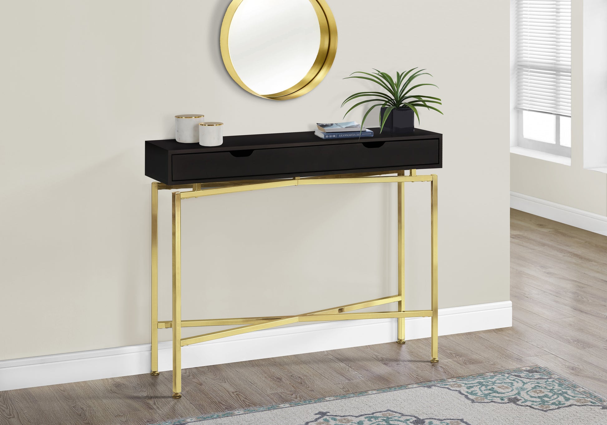 Ajoutez une touche de style contemporain à votre maison avec cette table console expresso. Idéale pour les entrées, les couloirs ou partout où vous souhaitez mettre en valeur vos pièces d'accent préférées, cette table se fondra parfaitement dans n'importe quel décor. Dotée d'une base en métal doré robuste et d'un dessus espresso chaud avec un grand tiroir de rangement, cette pièce avant-gardiste procure des années de plaisir durable.