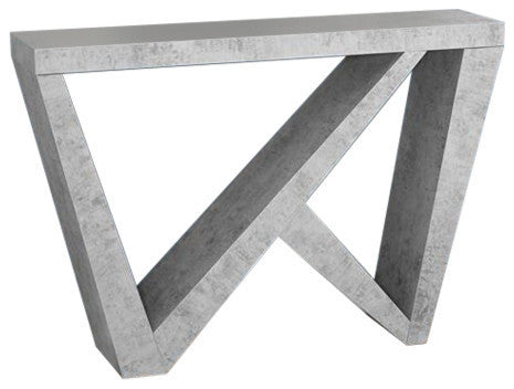 - Table console au fini aspect ciment gris avec une base au design asymétrique et des panneaux entrecroisés qui créent des espaces ouverts