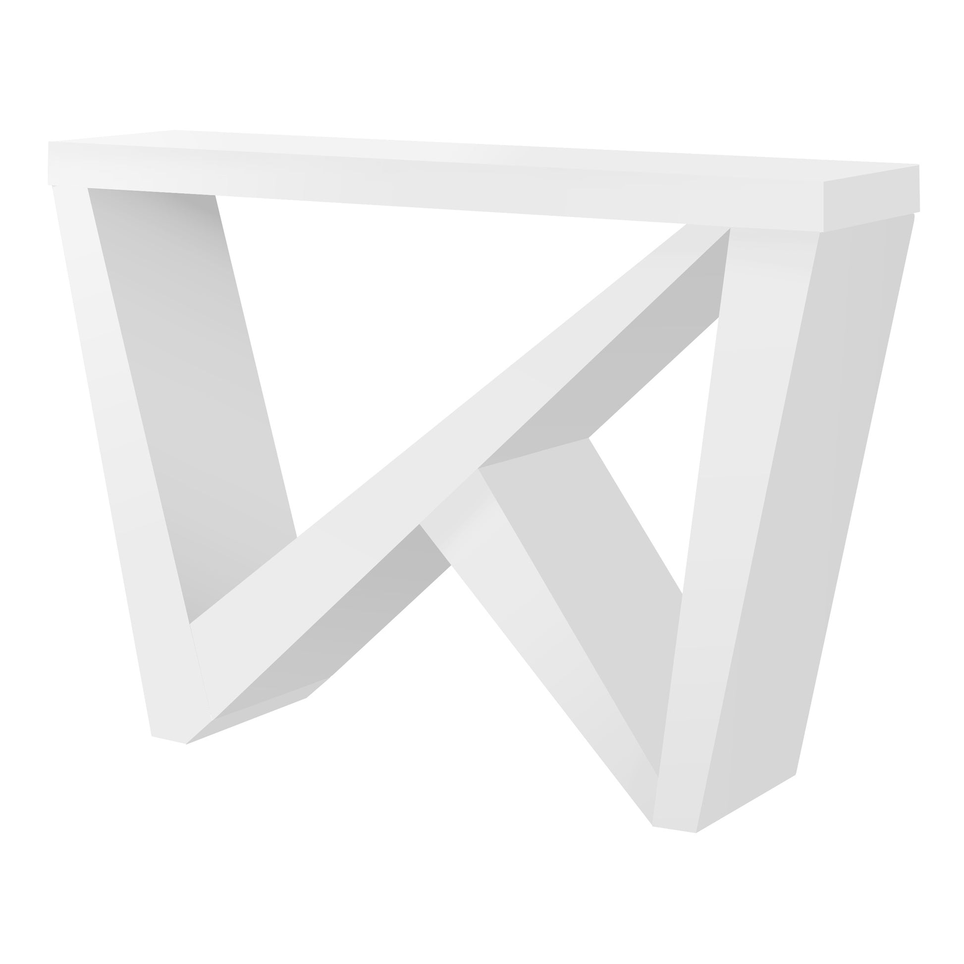 - Table console au blanc fini avec une base au design asymétrique et des panneaux entrecroisés qui créent des espaces ouverts