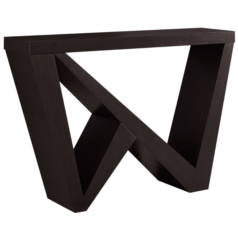 - Table console au fini espresso brun foncé avec une base au design asymétrique et des panneaux entrecroisés qui créent des espaces ouverts