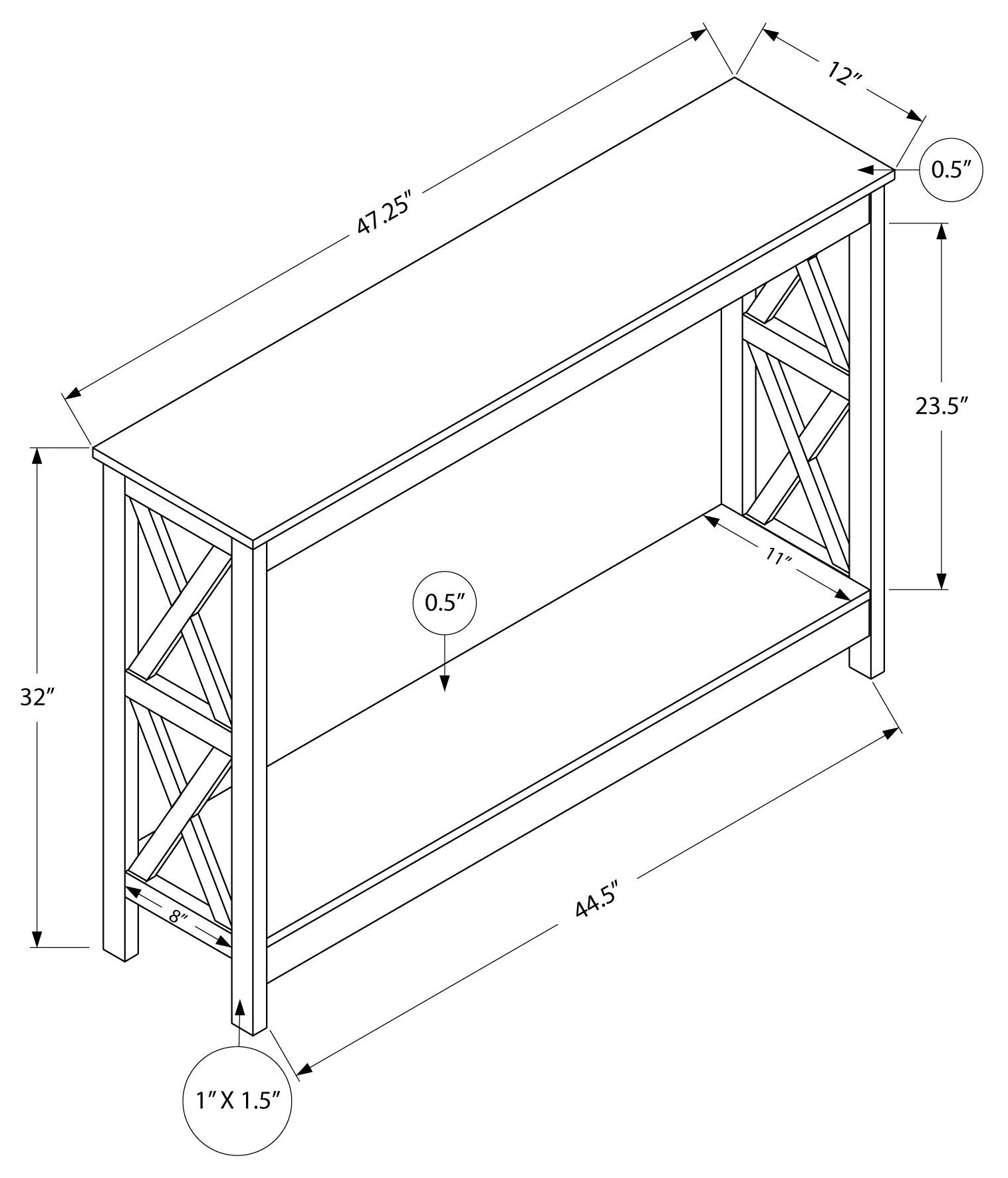 Cette console d'entrée de style transitionnel est une excellente toile pour mettre en valeur votre touche décorative. Une finition riche et lisse d'aspect bois gris stratifié sur tous les côtés, cette table d'appoint rectangulaire est jointe à un cadre en X épais à chaque extrémité, ce qui lui confère un attrait chaleureux. Avec une étagère inférieure ouverte pour un rangement supplémentaire, cette table console est suffisamment polyvalente pour être transportée dans d'autres espaces pour afficher des photos et des objets précieux, des livres, ou même comme un endroit pour mettre un plateau d'apéritifs lors de vos réceptions. Il y a tellement d'utilisations créatives pour cette table et sa taille longue et étroite la rend idéale pour les petits espaces. L'assemblage est nécessaire.