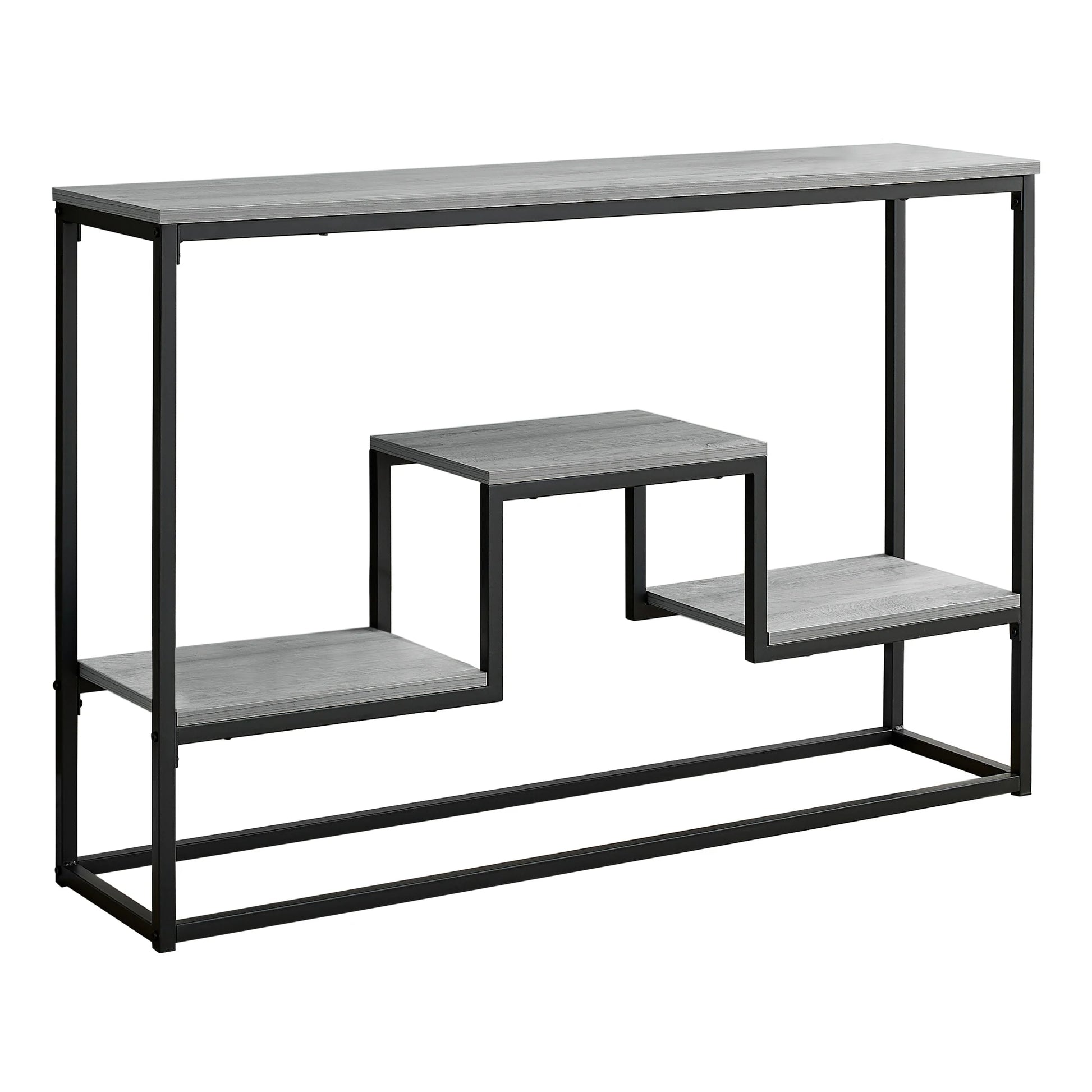 - Table console à plusieurs niveaux avec un long plateau rectangulaire et 3 finitions de rangement dans un aspect bois gris