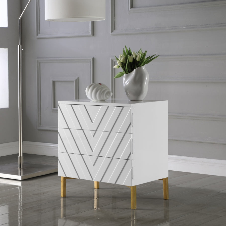 Mettez le style et le design à la pointe de la technologie avec cette table d'appoint Collette de Meridian Furniture. L'extérieur laqué d'un blanc ajoute une sophistication instantanée à votre pièce, et la riche base dorée ajoute à sa modernité et à son atmosphère contemporaine. La table d'appoint Collette a un motif à chevrons distinct qui traverse ses trois façades de tiroirs pour ancien un visuel intéressant sous tous les angles. Un plateau amplement dimensionné vous permet de poser facilement une lampe ou d'autres objets.
