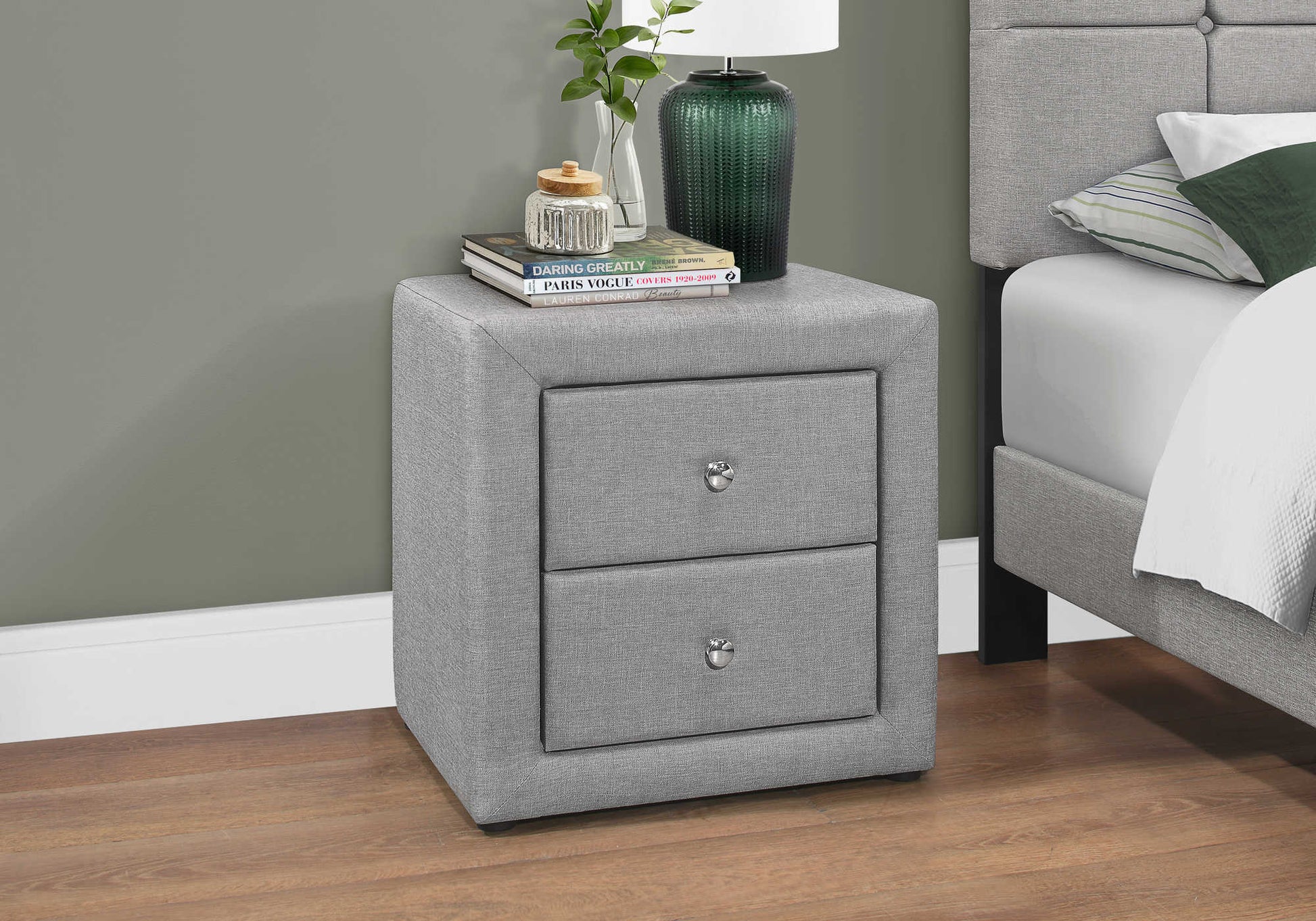 Cette table de chevet rembourrée démontre à quel point le minimalisme peut être à la fois chic et sophistiqué. Le design intemporel et contemporain met l'accent sur des lignes épurées et rectangulaires et des surfaces lisses. Cet accessoire de chambre est doté d'une structure en contreplaqué rembourrée de mousse et recouvert d'un tissu d'apparence lin gris. Les boutons de tiroir en métal chromé offrent un contraste avec cette table d'appoint rembourrée en tant qu'élément de style supplémentaire. Cette table de chevet comprend également deux tiroirs de rangement, vous offrant plus d'espace pour ranger des objets à votre chevet. Cette collection comprend un assortiment de lits (disponible en taille Queen, Twin ou Full) qui est vendu séparément.