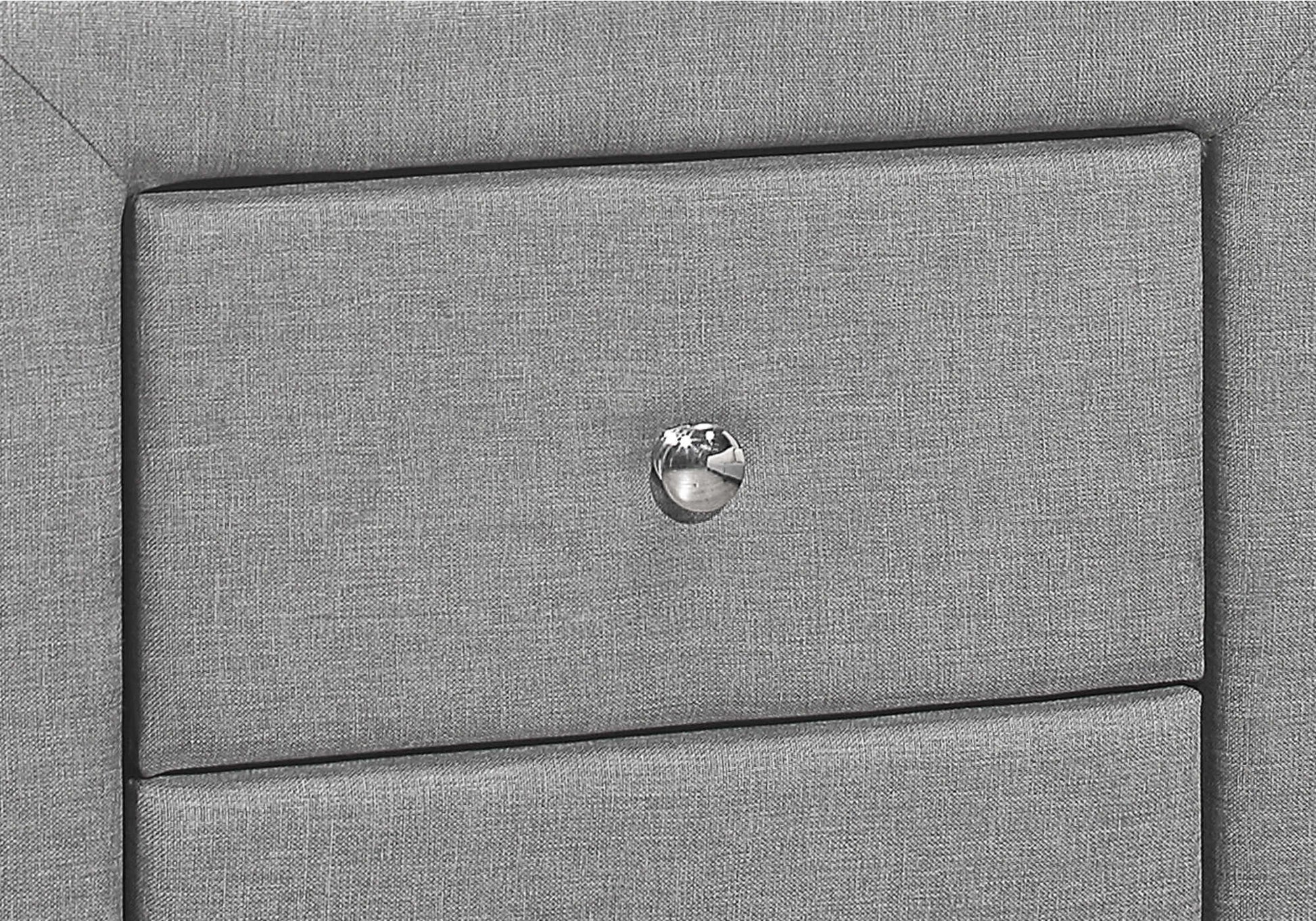 - Recouvert d'un tissu d'apparence lin gris avec un bouton de tiroir en métal au fini chromé