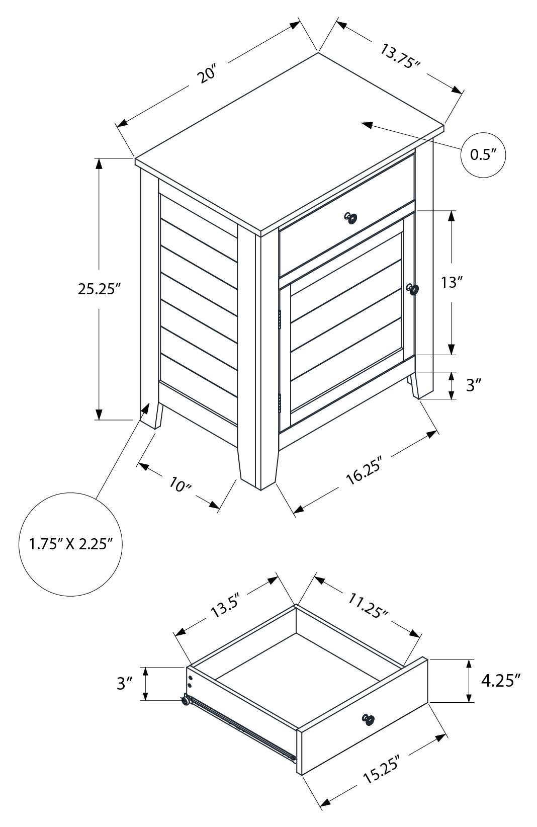Apportez la combinaison parfaite de style et de fonctionnalité dans une pièce avec cette table d'accent latéral de 25 pouces de haut. Conçu dans un style de transition avec une inspiration côtière, cette table d'économie d'espace est terminée de tous les côtés dans un placage gris lavé venteux pour un look détendu décontracté. Placez une lampe de table et quelques accessoires décoratifs sur le haut spacieux et facile à nettoyer et placez-le à côté d'un canapé ou d'une chaise comme extrémité ou table d'appoint dans un salon ou utilisez-le comme table de chevet dans la chambre. Offrant beaucoup de rangement avec un tiroir et une armoire fermée avec des panneaux de plaquettes à l'avant et les côtés, et complétés par des boutons métalliques simples, cette table durablement conçue sera la pièce de meubles la plus pratique que vous posséderez. Facile à assembler avec toutes les pièces et les instructions illustrées incluses, ce tableau est soutenu par une garantie limitée de 5 ans contre les défauts du fabricant pour votre confiance et de nombreuses années de plaisir.