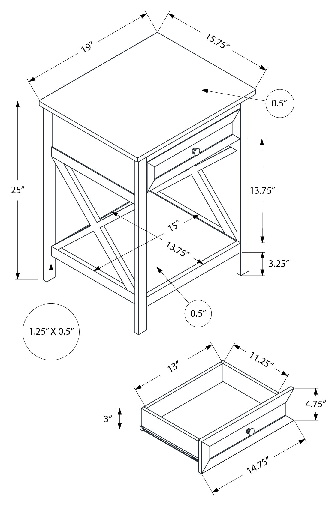 Apportez la combinaison parfaite de style et de fonctionnalité à une pièce avec cette table d'accent à 2 niveaux et 25 pouces de haut. Conçu dans un style de transition, cette table d'appoint de sauvegarde de l'espace est finie dans un placage chic de tous les côtés et accentué d'une conception X à chaque extrémité pour un look décontracté haut de gamme. Placez une lampe et quelques accessoires décoratifs sur le haut spacieux et facile à nettoyer et placez-le à côté d'un canapé ou d'une chaise comme table de bout dans un salon ou utilisez-le comme table de nuit dans une petite chambre pour un look frais. Offrant beaucoup de rangement avec un tiroir lambrissé sur des glissements en métal lisse et complétés par un bouton d'or léger simple, ainsi qu'une étagère de fond pratique pour un stockage supplémentaire et un espace d'affichage. Facile à assembler avec des instructions illustrées, toutes les pièces et protecteurs de sol inclus, ce tableau durable est soutenu par une garantie limitée de 5 ans contre les défauts du fabricant pour votre confiance et votre satisfaction.
