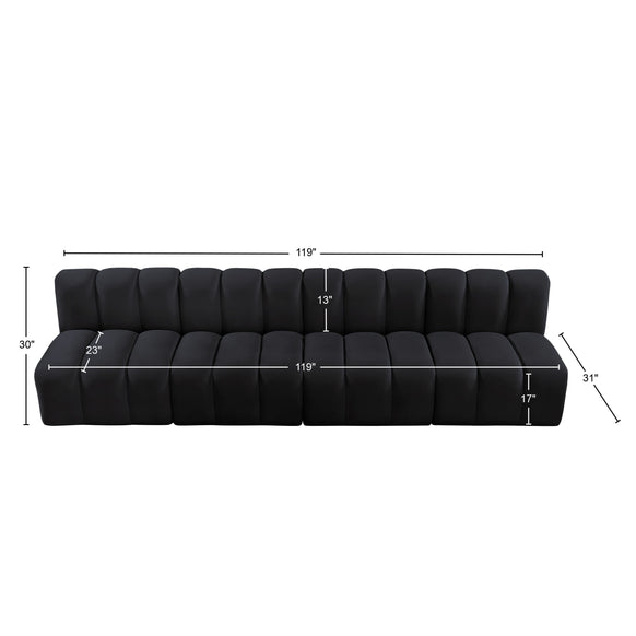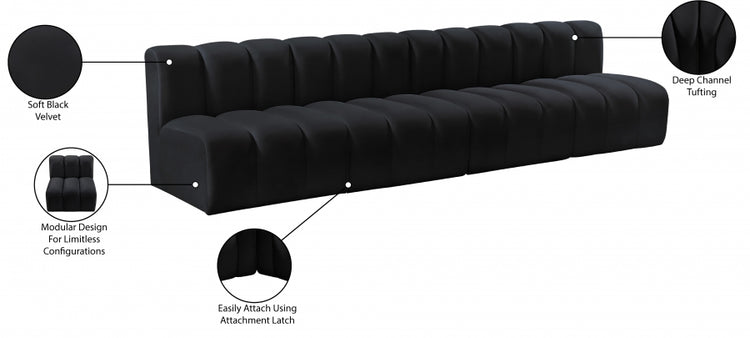 Give your living room or den the perfect blend of style and versatility with this Arc velvet fabric curved modular sofa. Part of the Arc modular furniture collection, this sofa comes upholstered in rich black velvet fabric and features deep channel tufting that adds a touch of luxury while enhancing comfort and support. A seamless combination of form and function, this chair can be used with other Arc pieces to create a myriad of configurations in your well-curated room.