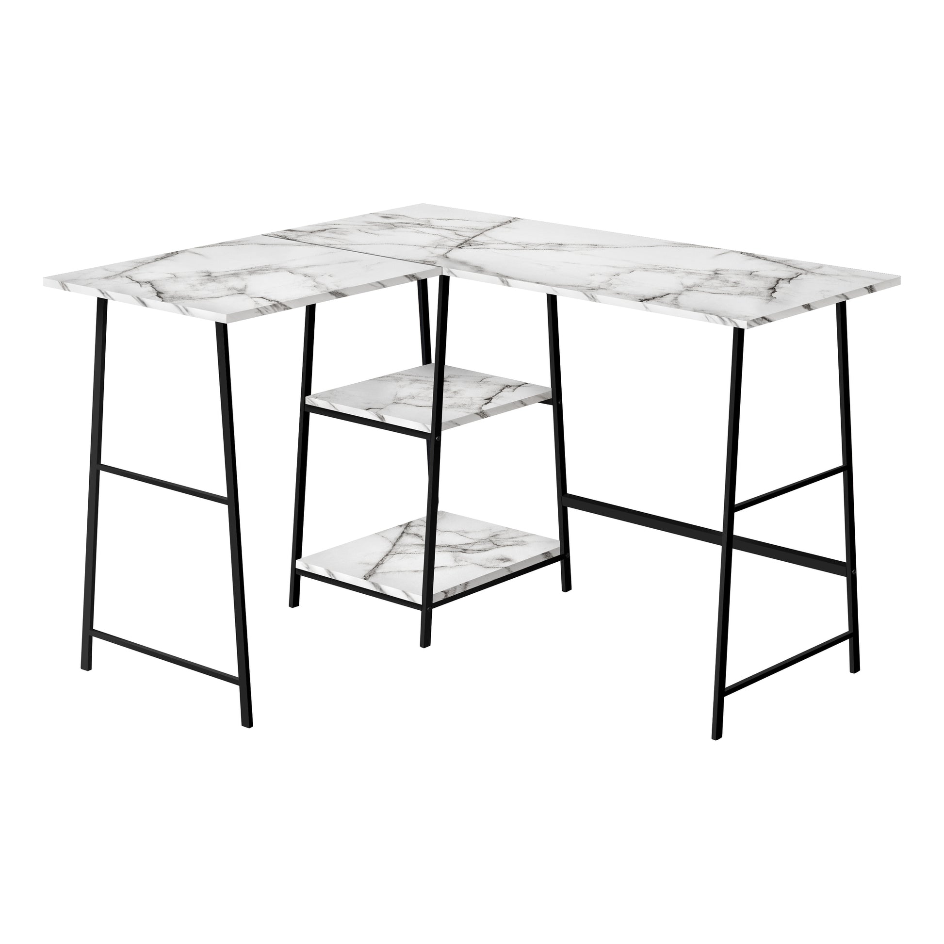 Faites travailler votre bureau d'ordinateur d'angle aussi dur que vous. Ce bureau offre style et fonctionnalité de haut en bas, à commencer par son bureau spacieux au fini blanc lisse. Les pattes de style chevalet en métal servent de support à 2 étagères ouvertes qui peuvent être utilisées pour exposer des livres, de petites boîtes de rangement ou d'autres objets. La conception compacte et le style industriel de ce bureau d'écriture unique en forme de L maximisent l'espace et le potentiel de stockage afin que vous puissiez maximiser la productivité.
